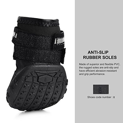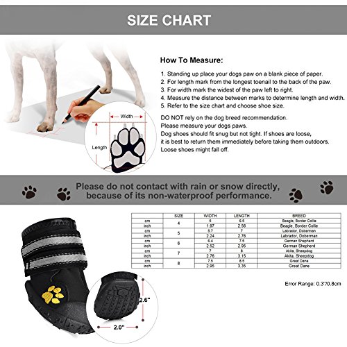 -. Feature : Made of tough, water resistant material, capable to keep debris out, and bring more comfort and cool to paws. / Flexible, skid-resistant and waterproof sturdy soles, well provide traction and offer serious paw protection in wet and dry, hot and cold conditions. / Easy to put on with wide split seam top opening, firmly fastened by 2 long, adjustable, and reflective Velcro straps, difficult to slip off, also make it safe at night. / Cute pet paw Embroidery, Fashionable yet durable, Soft and hand washable.? / Measure paw width for best fit. If the paw is in-between two sizes, select the arger size. See size chart with actual size of boots.