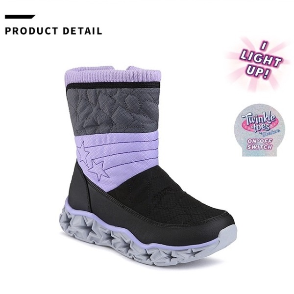 MD'S COMMENT신규 S라이트 부츠입니다. 아동에게 가장 인기가 많은 패딩 부츠 타입으로내측에 지퍼가 있어 간편하게 착화할 수 있도록 디자인 되었습니다. 패딩에 별모양 패턴으로재미요소를 더해주었으며 앞코와 발볼쪽에 내구성을 강화하기 위해 가죽 소재를 사용하였습니다.경량성 3D 별모양 아웃솔에서 걸을 때 마다 컬러풀한 라이트를 제공합니다.굽높이는 약 3cm입니다. (베터리 평균수명 3개월/연속60시간/ON/OFF 스위치 기능)*SIZE FIT:타이트한 핏으로 한사이즈 크게 신으시길 추천드립니다.무게:209g(190size 한짝 기준)