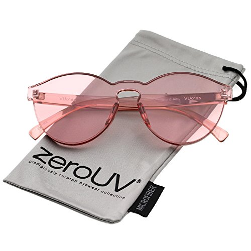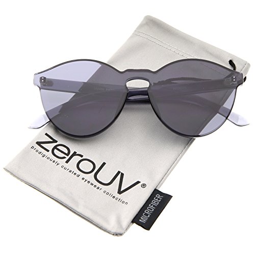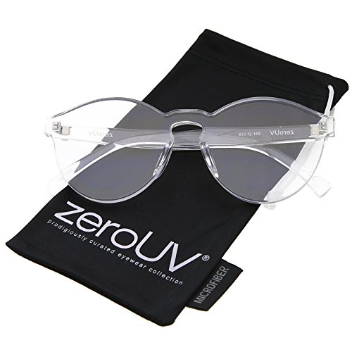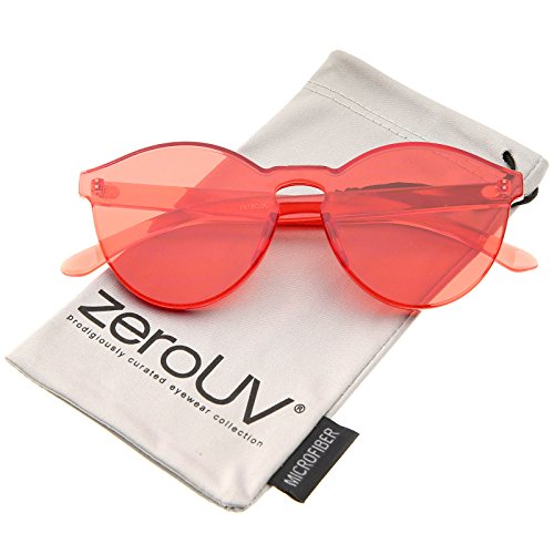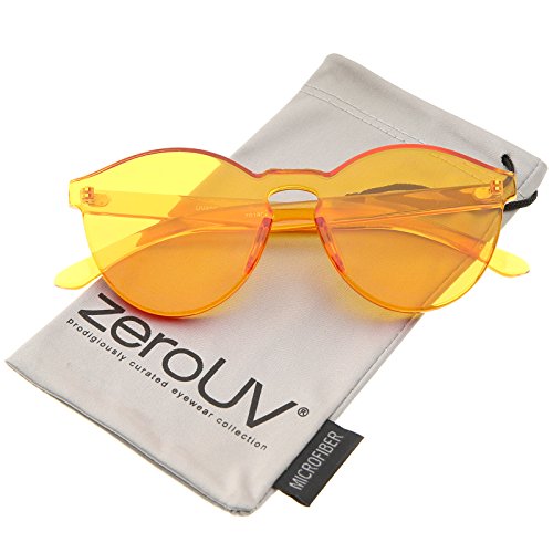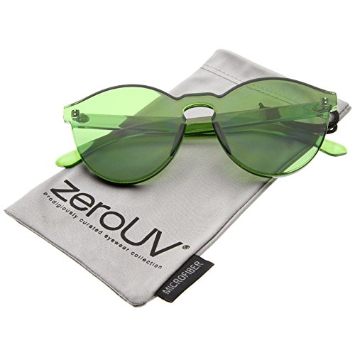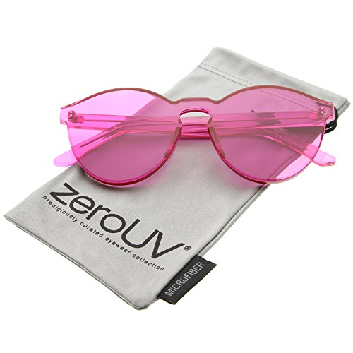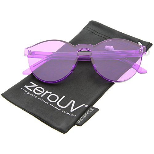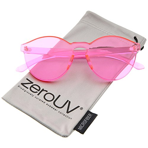 Futuristic block cut sunglasses features an all-lens build made from a single piece of colorful translucent material. Simultaneously functional and stylish, these shades showcase a frameless silhouette. The minimalist, one piece construction extends throughout the entire frame, arm to arm along with the bridge. Opt for this sleek and eye popping accessory that is perfect for the season. Made with a plastic based frame and reinforced metal hinges. PLEASE NOTE: these glasses may not be difficult to see out of, do NOT offer UV protection and are intended for looks and novelty use only. Lens Height: 54 mm | Lens Width: 60 mm | Bridge: 21 mm | Frame Total: 143 mmFeature