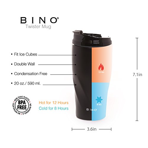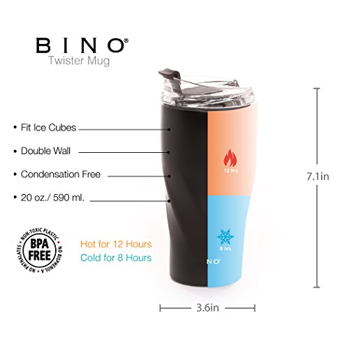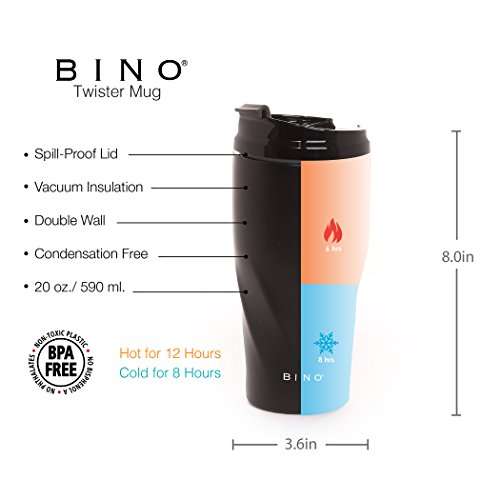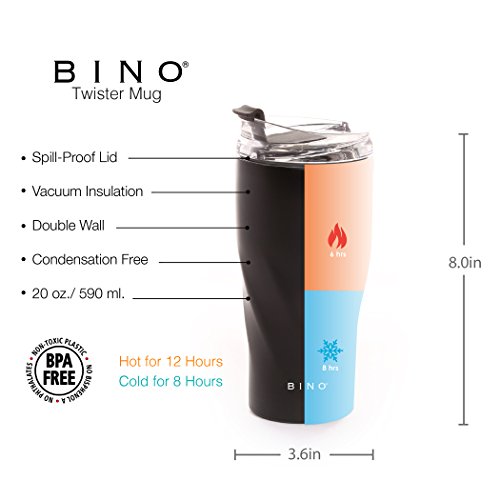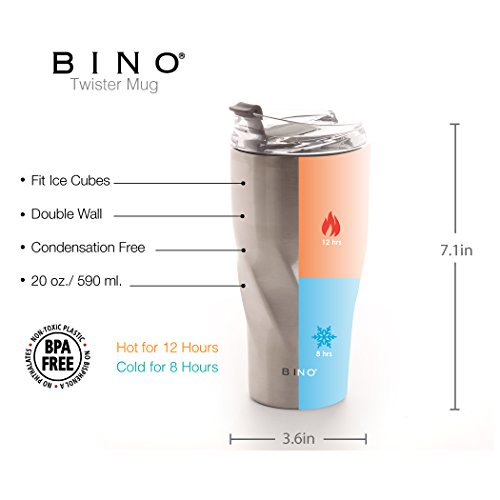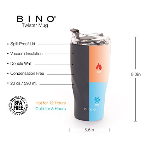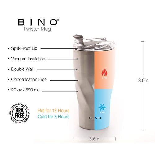 Studio : BINO Publisher : BINO Binding : Misc. Product Description BINO's 20 ounce Double Walled Vacuum Insulated Stainless Steel Mug keeps liquids cold for 8 hours and hot for 6 hours. Our Mug is 100% BPA-Free and made from all non-toxic materials. Our mug is condensation free, fits ice cubes and features a conveniant spill-proof screw top lid that makes it easy to take a drink on the go! 0