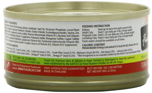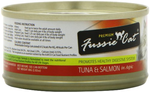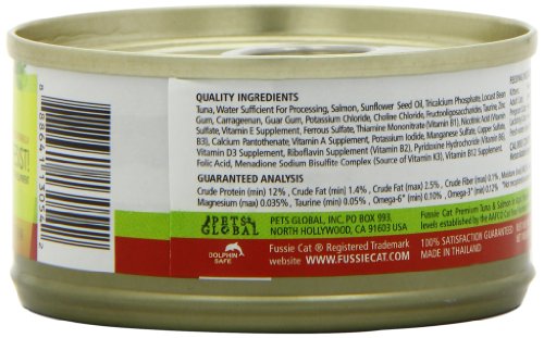 Promotes a healthy digestive system with prebiotic fructooligosaccharides Made in human consumables manufacturing plant Choice cuts of quality tuna With salmon Grain-free and rich in DHA Brand : Fussie Cat Item model num : FCC002 MPN(PartNumber) : FCC002 EAN : 0622013157726