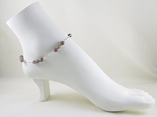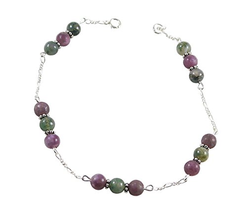 -. Title : Station Style Moss Agate Ankle Bracelet with Lepidolite - 9 1/2" - Sterling Silver