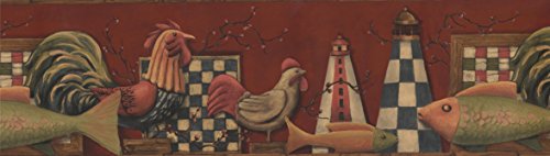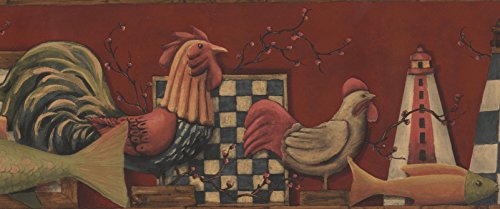 -. Title : Roosters and Fish Animals in Kitchen Wallpaper Border for Cottage Kitchen Bathroom Living Room, Roll 15' x 7''