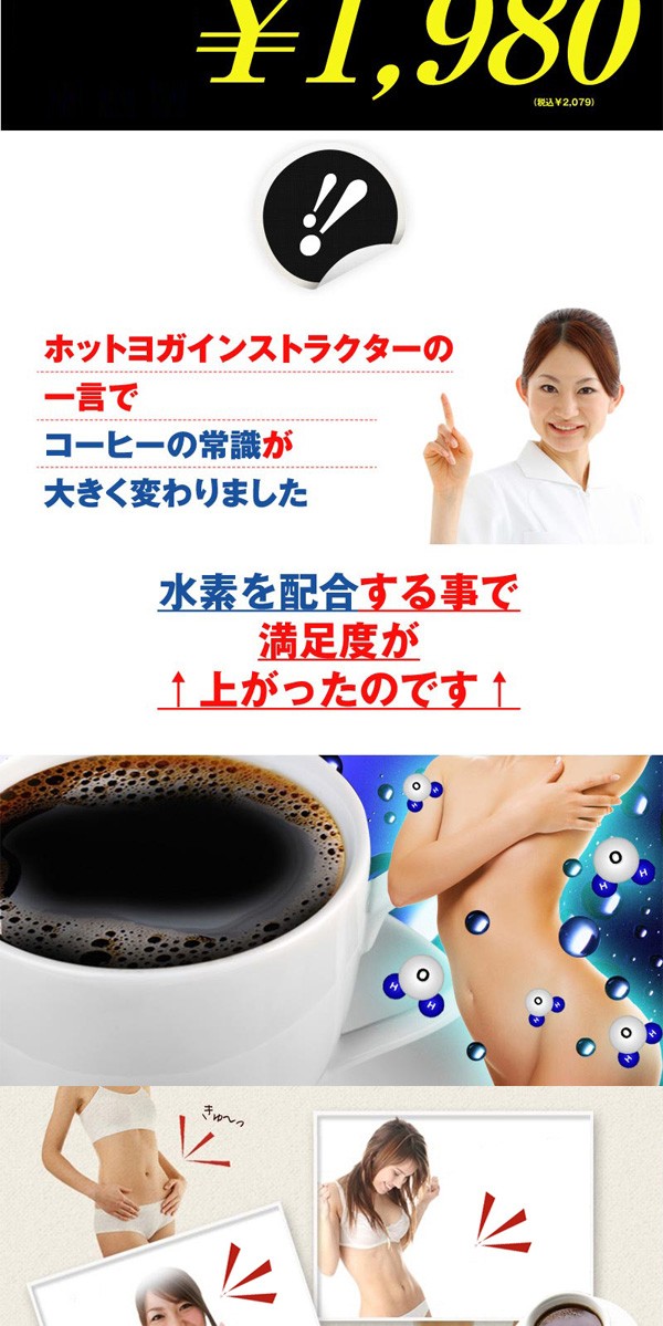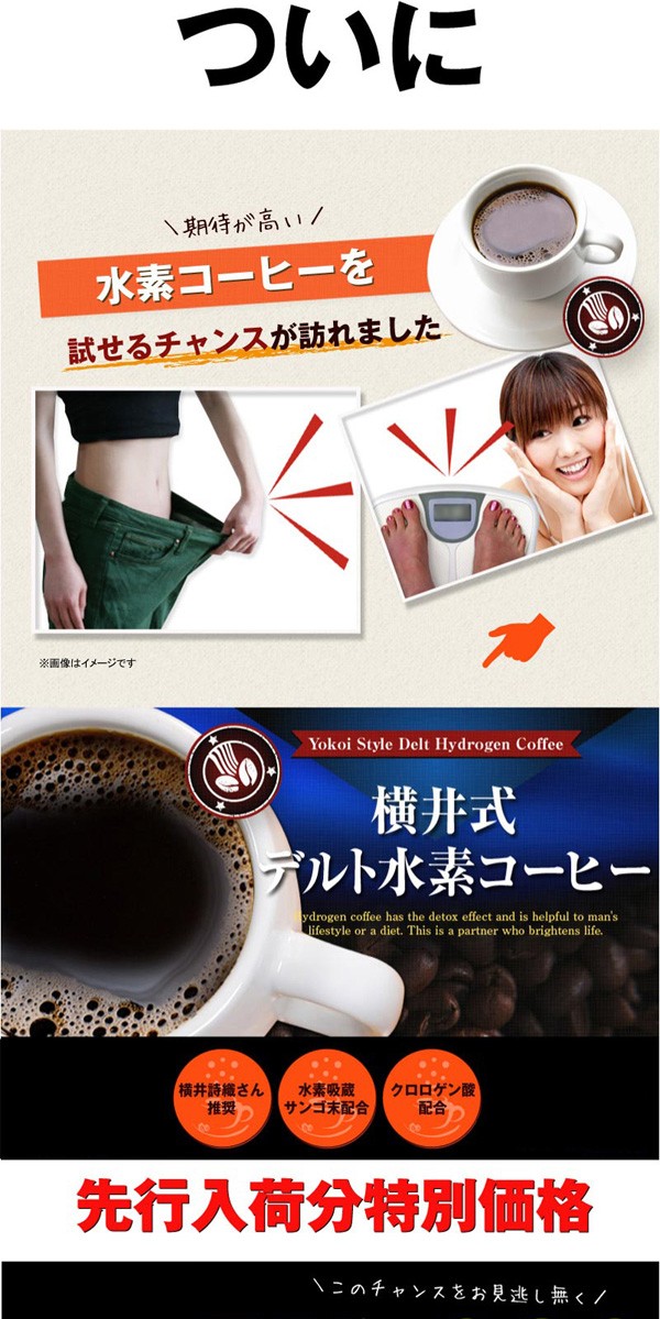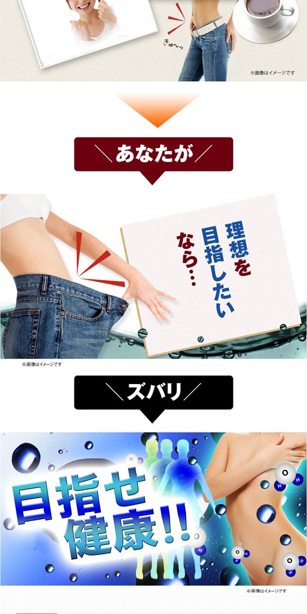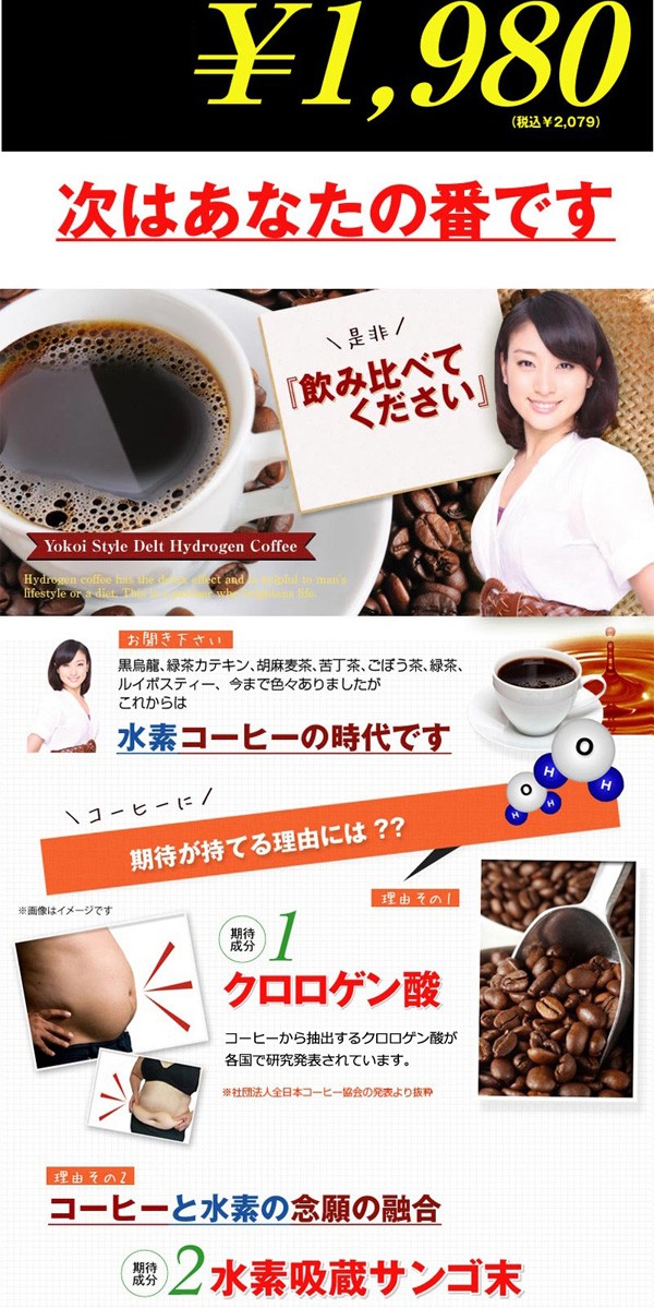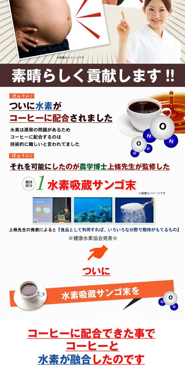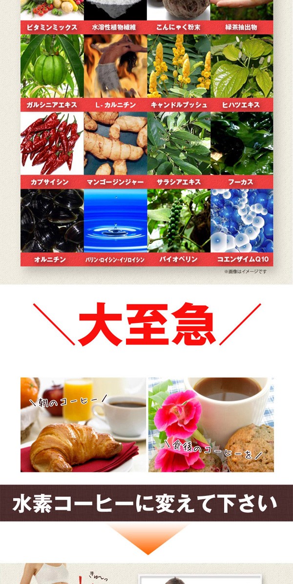 水溶性食物繊維、インスタントコーヒー粉末、水素吸蔵サンゴ末、未焼成サンゴカルシウム、緑茶抽出物、こんにゃく粉末、白インゲン豆抽出物、ガルシニアカンボジアエキス、サラシアレティキュラータエキス、キャンドルブッシュエキス、ヒハツエキス、唐辛子抽出物(カプサイシン含有)、黒胡椒抽出物(バイオペリン含有)、マンゴージンジャー、フーカス粉末、コエンザイムQ10、L-カルニチン、L-オルニチン、L-バリン、L-ロイシン、L-イソロイシン、ビタミンC、ナイアシン、ビタミンE、パントテン酸Ca、ビタミンB1、ビタミンB2、ビタミンB6、ビタミンA、葉酸、ビタミンD、ビタミンB12、香料 |