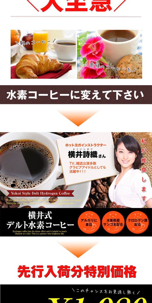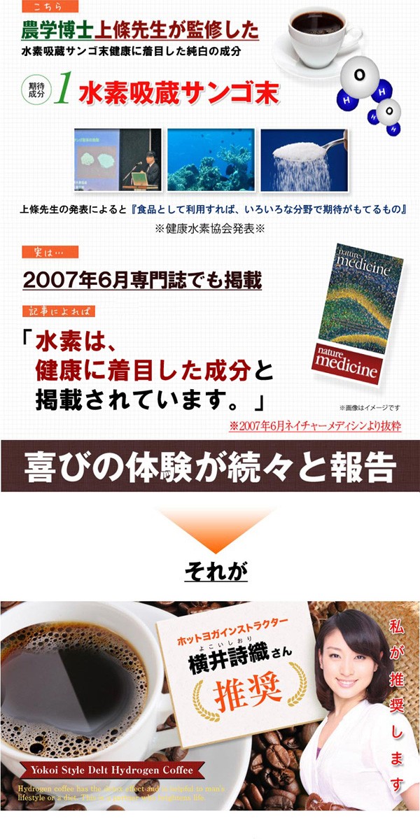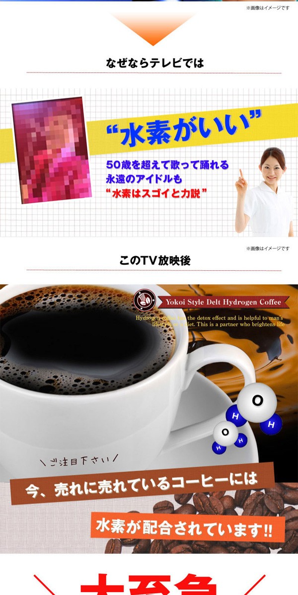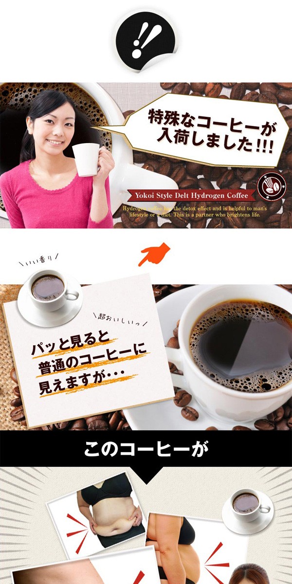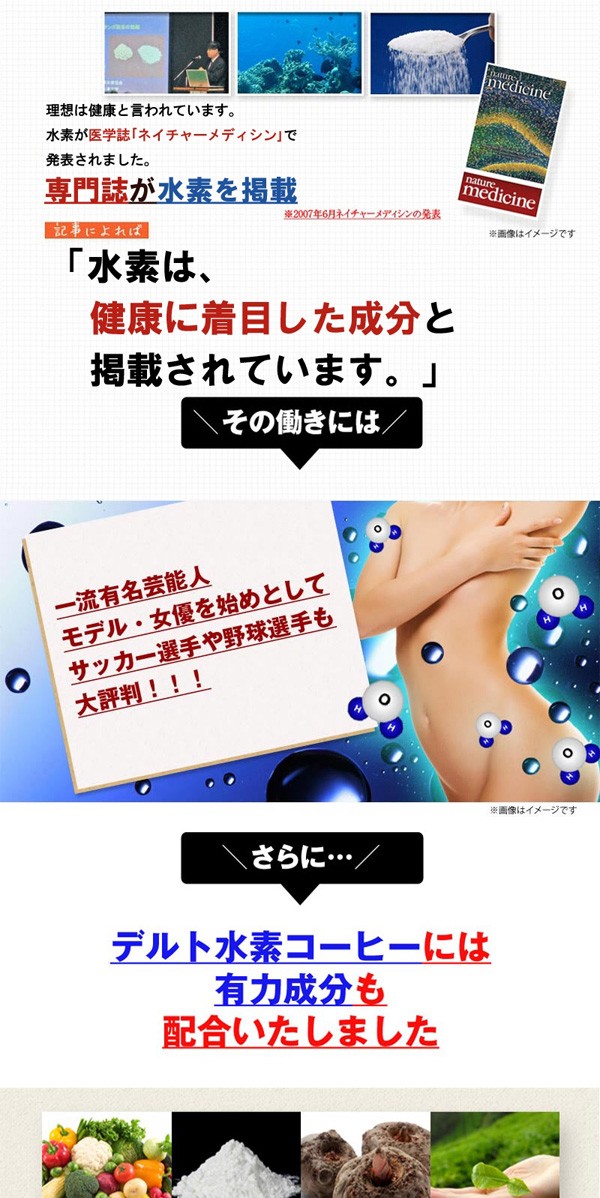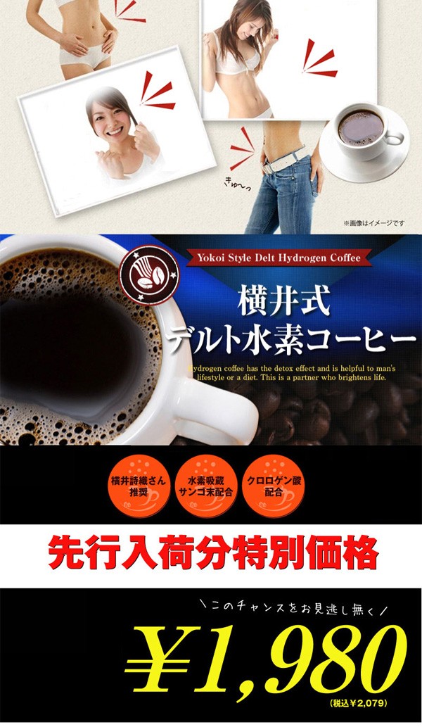 水溶性食物繊維、インスタントコーヒー粉末、水素吸蔵サンゴ末、未焼成サンゴカルシウム、緑茶抽出物、こんにゃく粉末、白インゲン豆抽出物、ガルシニアカンボジアエキス、サラシアレティキュラータエキス、キャンドルブッシュエキス、ヒハツエキス、唐辛子抽出物(カプサイシン含有)、黒胡椒抽出物(バイオペリン含有)、マンゴージンジャー、フーカス粉末、コエンザイムQ10、L-カルニチン、L-オルニチン、L-バリン、L-ロイシン、L-イソロイシン、ビタミンC、ナイアシン、ビタミンE、パントテン酸Ca、ビタミンB1、ビタミンB2、ビタミンB6、ビタミンA、葉酸、ビタミンD、ビタミンB12、香料 |