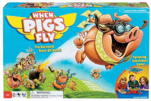 -. Feature : Barnyard blast-off game that keeps kids squealing for hours / Game assembly and (2) "AA" batteries required / Includes (12) pigs, (4) cannons, a motorized game base, support elements, circular cloud cone and game instructions / Recommended for children 5-years of age and older