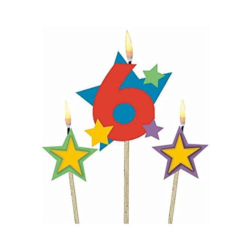 Party Time Stars and Number 6 Celebration Candle on a Stick, Pack of 3, Multi , 7" Wax