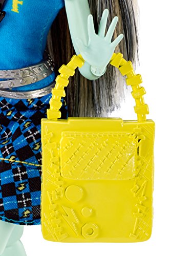 The Monster High dolls are ready for the howl ways dressed for the first day of school. Frankie Stein doll looks fabulous in her signature look. Flexibility at the shoulders and knees adds to the fun with more scary cool poses and storytelling possibilities. The daughter of Frankenstein is electrifying in a yellow, black and silvery dress with collared shirt and vest bodice and vibrant plaid skirt. Flawesome fashion accessories include a gore-geous pair of black kicks, a lightning bolt necklace, silvery belt and yellow lightning bolt-decorated purse. Look for monsterrific touches, like her streaked hair and body stitches, that showcase this favorite Monster High character’s freaky fabulous flaws. Ghouls at home will love learning to embrace what makes them unique along with their beast friends from Monster High. Collect all of the Monster High dolls for a full class attendance in your howl ways (each sold separately, subject to availability). Includes articulated Frankie Stein doll wearing fashion and accessories. Doll cannot stand alone. Colors and decorations may vary.Feature