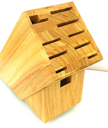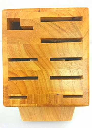 10 slots for 8 knives and 1 sharpening steel and 1 pairs of shears. Space saved on counter top : 4.5" L x 11" D x 8.5" H. Hardwood block with rubberized base for stability. Used to store the variety of knives for your kitchen.