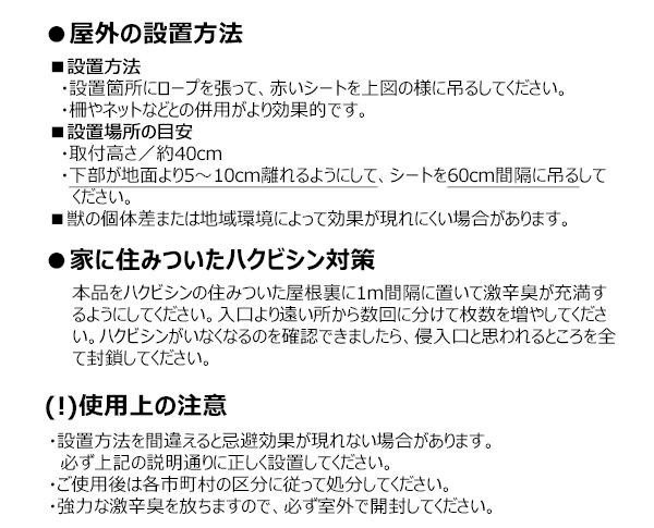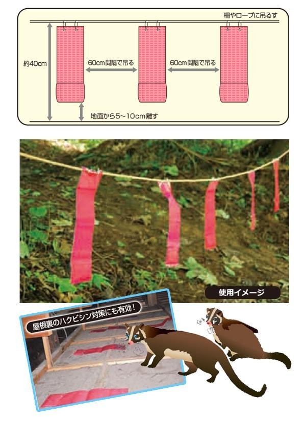ハクビシンやタヌキ、アライグマ等の嫌う10種類の天然成分を配合した激辛臭でハクビシン等を寄せ付けないようにします。また、赤色を嫌うハクビシン等の習性を利用し、色・揺れで威嚇する事により慣れを防ぎます。 |