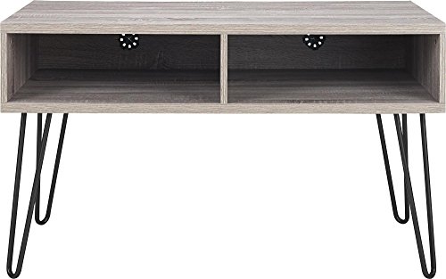 - Feature : Retro-style table with hairpin legs / Sonoma oak wood grain finished top with gunmetal gray metal legs / 24.61"H x 41.97"W x 19.49"D / Accommodates flat panel TVs up to 42" / 2 open storage shelves - Great for Gaming