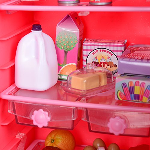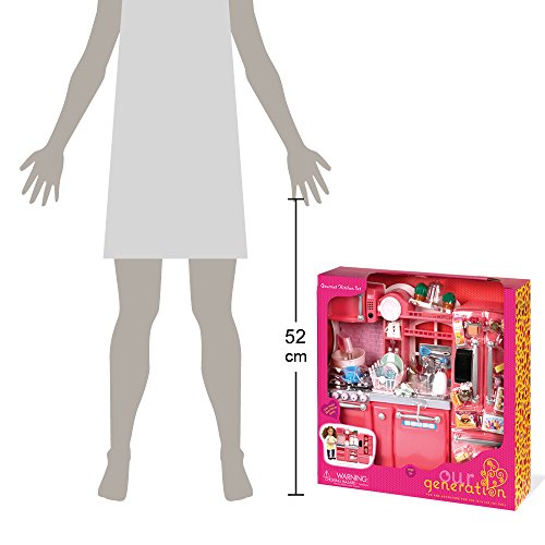 The Our Generation Gourmet kitchen set is packed with all of the essentials your doll needs to cook up a Storm. Everything from baking muffins and grilling hamburgers, to cleaning up the mess afterwards, is at her finger tips. This realistic and completely playable kitchen is fully compatible with most 18" dolls, including American girl dolls and accessories. Includes: 1 kitchen unit with dishwasher, 3 fridge shelves, 2 shallow hanging drawers, 2 deep hanging drawers, 2 fridge door boxes with lids, 1 fridge door caddy, 4 fridge door shelves, 1 oven shelf, 3 dishwasher racks, 1 oven drawer, 1 refrigerator, 1 dishrack with 1 dishrack tray, 1 sink drainer, 2 plants, 1 cookie sheet, 1 mixer, 1 measuring cup and 1 set of measuring spoons, 1 pitcher, 2 glasses, 2 mugs, 1 mixing bowl, 2 plates, 2 bowls, 1 small pot, 1 frying pan with 1 lid, 1 ladle, 1 spatula, 1 cookie jar with 1 lid, 3 cookies, 1 piece of cheese, 1 orange, 1 pepper, 1 tomato, 2 tin cans, 1 egg tray, 6 eggs, 1 milk jug, 1 butter tray with butter and 1 lid, 1 bottle of olive oil, 1 jar of chocolate spread, 1 jar of Peanut butter, 1 basket of raspberries, 1 salt and 1 pepper shaker, 1 juice carton, 1 popsicle box, 1 hamburger box, 1 ice cream carton, and 1 cereal box. Doll and outfit sold separately. For ages 3+.Feature
