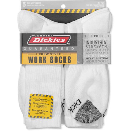-. Binding : Apparel -. Brand : Dickies -. Color : Solid White w/ Grey Toe -. Department : mens -. EAN : 0737899506299 -. Feature : Ventilated Breathing Channel - For air circulation and moisture control. / Arch Support - Added compression for Superior Comfort / Moisture Control Fibers - Keep feet cool and dry. / Reinforced and Reciprocated Heel & Toe - Added durability and superior fit. / Full Cushion Sole - Full cushion sole for added comfort. -. PackageQuantity : 5 -. ProductGroup : Apparel -. ProductTypeName : SOCKSHOSIERY -. Size : 6-12 -. Title : Dickies Men's 5-Pair Crew Work Socks - Solid White w/ Grey Toe (6-12) -. UPC : 737899506299