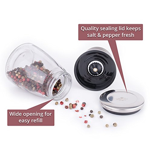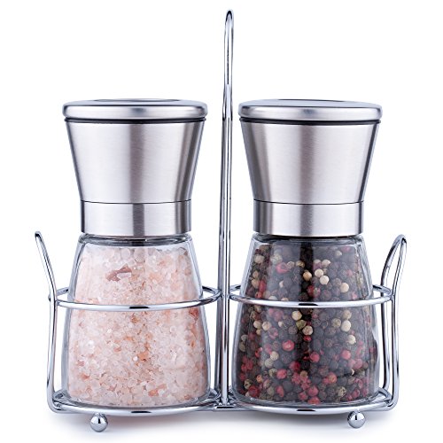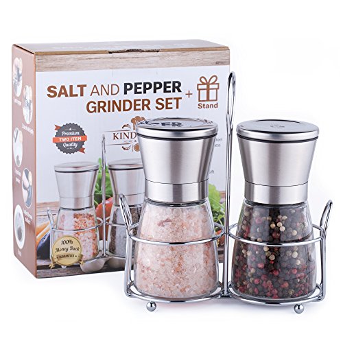 Premium Salt and Pepper Grinder Set - 2 Glass Body Mills with Steel Stand - 5 Grade Adjustable Ceramic Rotor, Efficient Stainless Steel Lids, Modern Design, Salt and Pepper Shakers by Kind Che