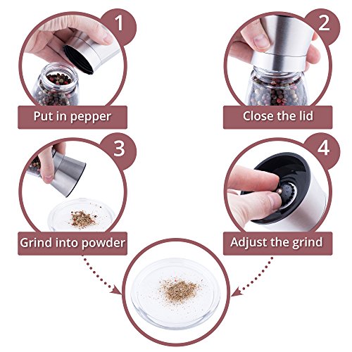 5 GRIND SETTINGS – Adjust the grind level by yourself with this stainless steel salt and pepper mill grinder set. A convenient regulator offers 5 positions which let you grind spices at any level you choose
