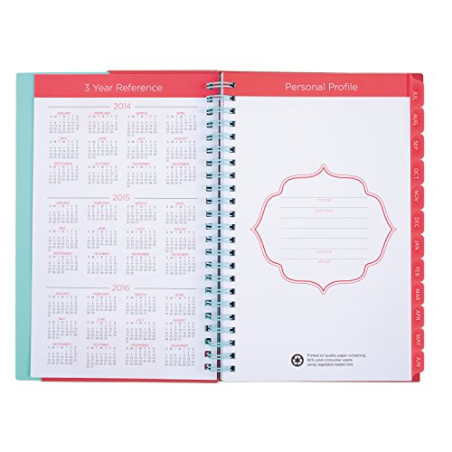 Academic year weekly and monthly planner brightens your day with a with a swoosh of magenta and orange that makes it impossible to lose track of. 12 months, from July 2015-June 2016. 4.88 x 8 inch page size. One week per spread, ruled 1.75 x 4 inch daily blocks with notes space, Julian dates. One month per spread with 1.4 x 1 inch unruled blocks, notes space, reference calendars, Julian dates. Mylar tabs offer easy navigation. Reference pages include 3-year reference calendars, contacts, notes pages, event calendar, and a 4-year holiday reference. Printed on quality paper containing 30% post-consumer waste.