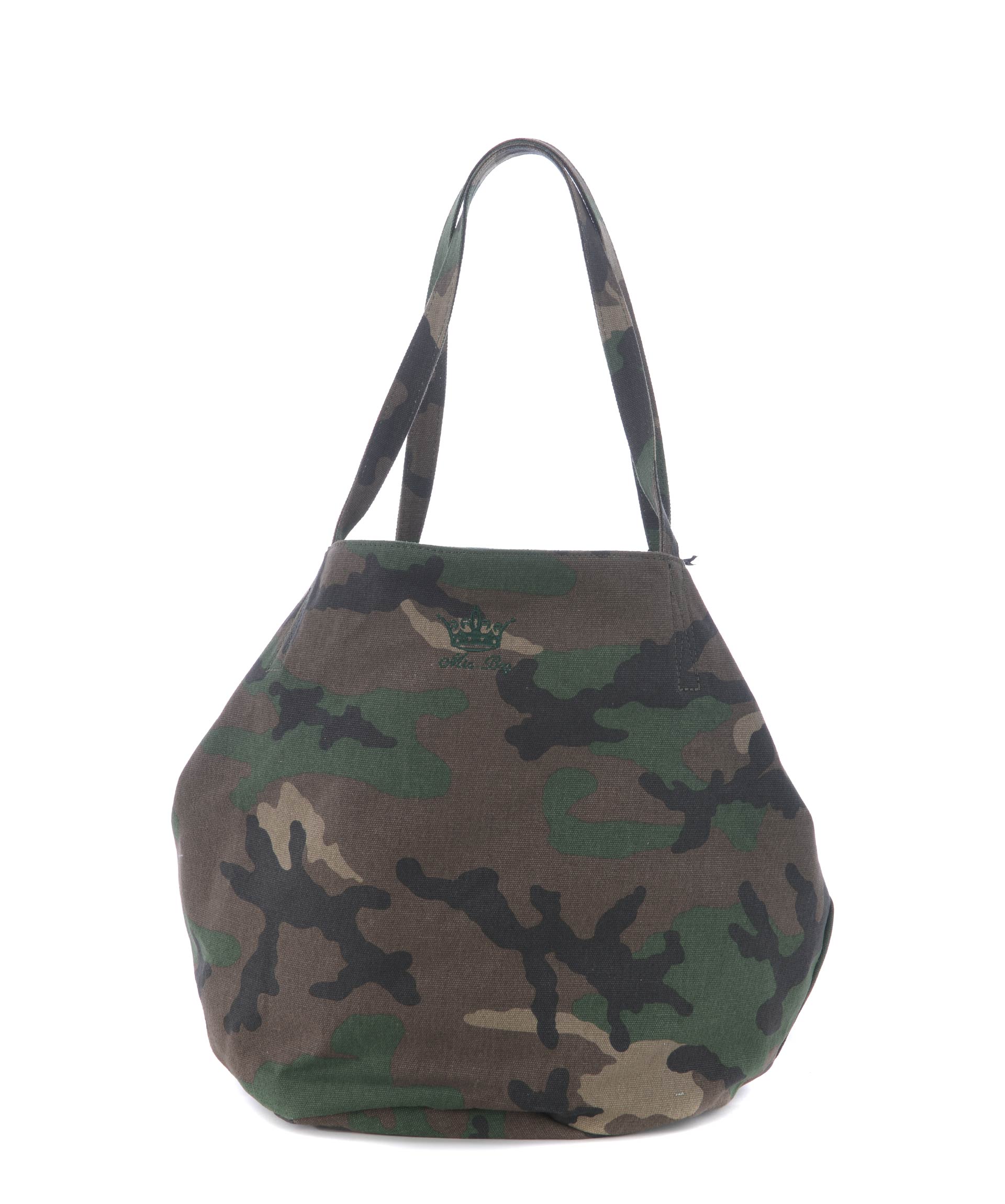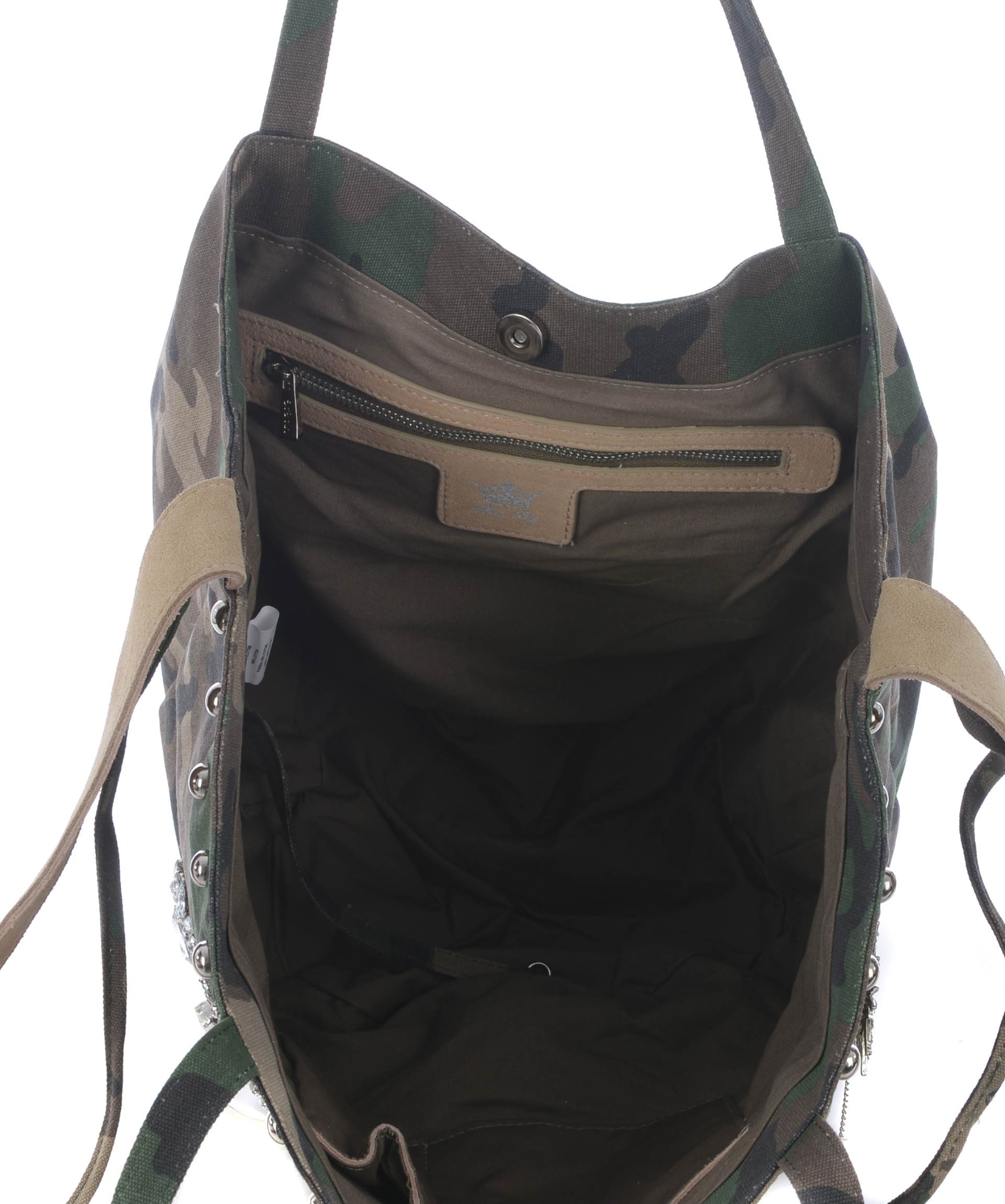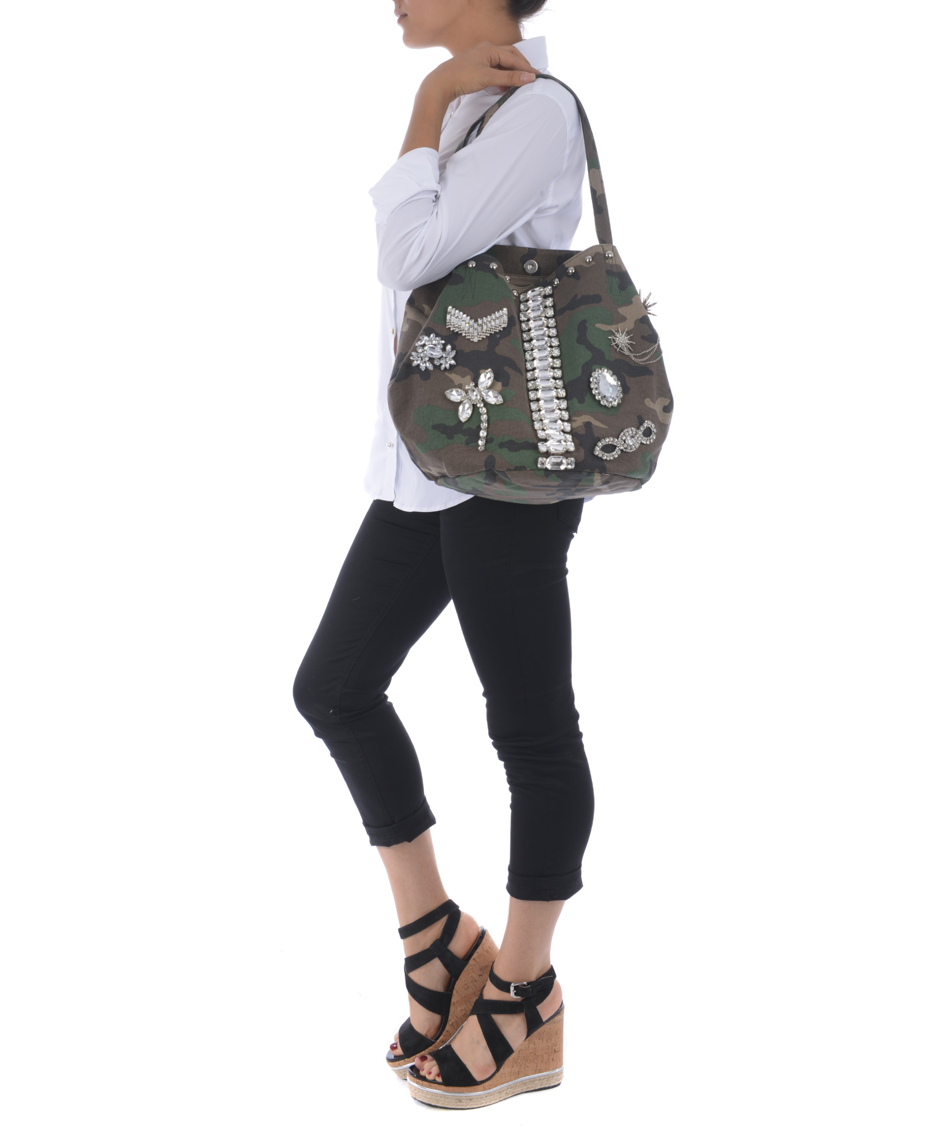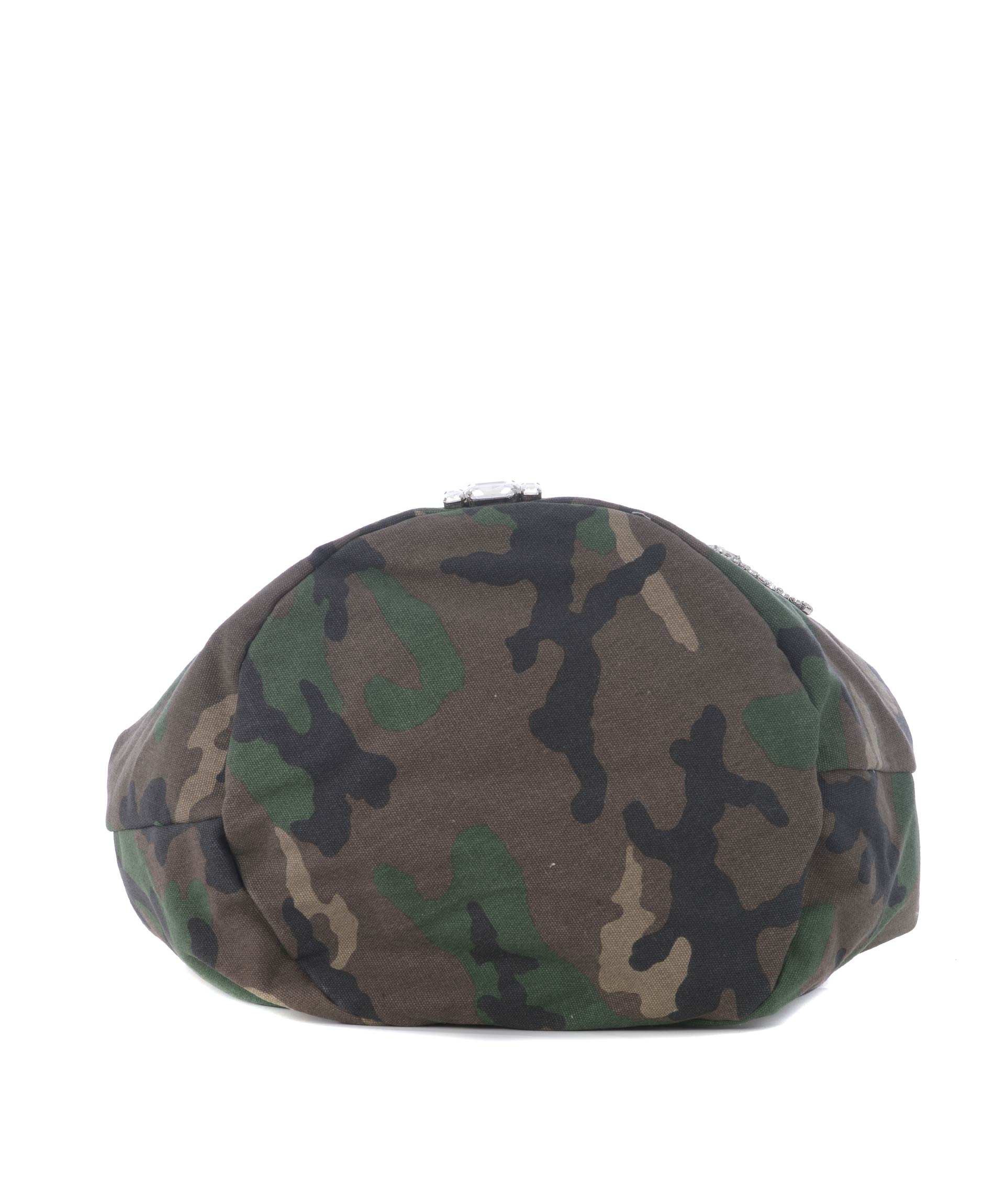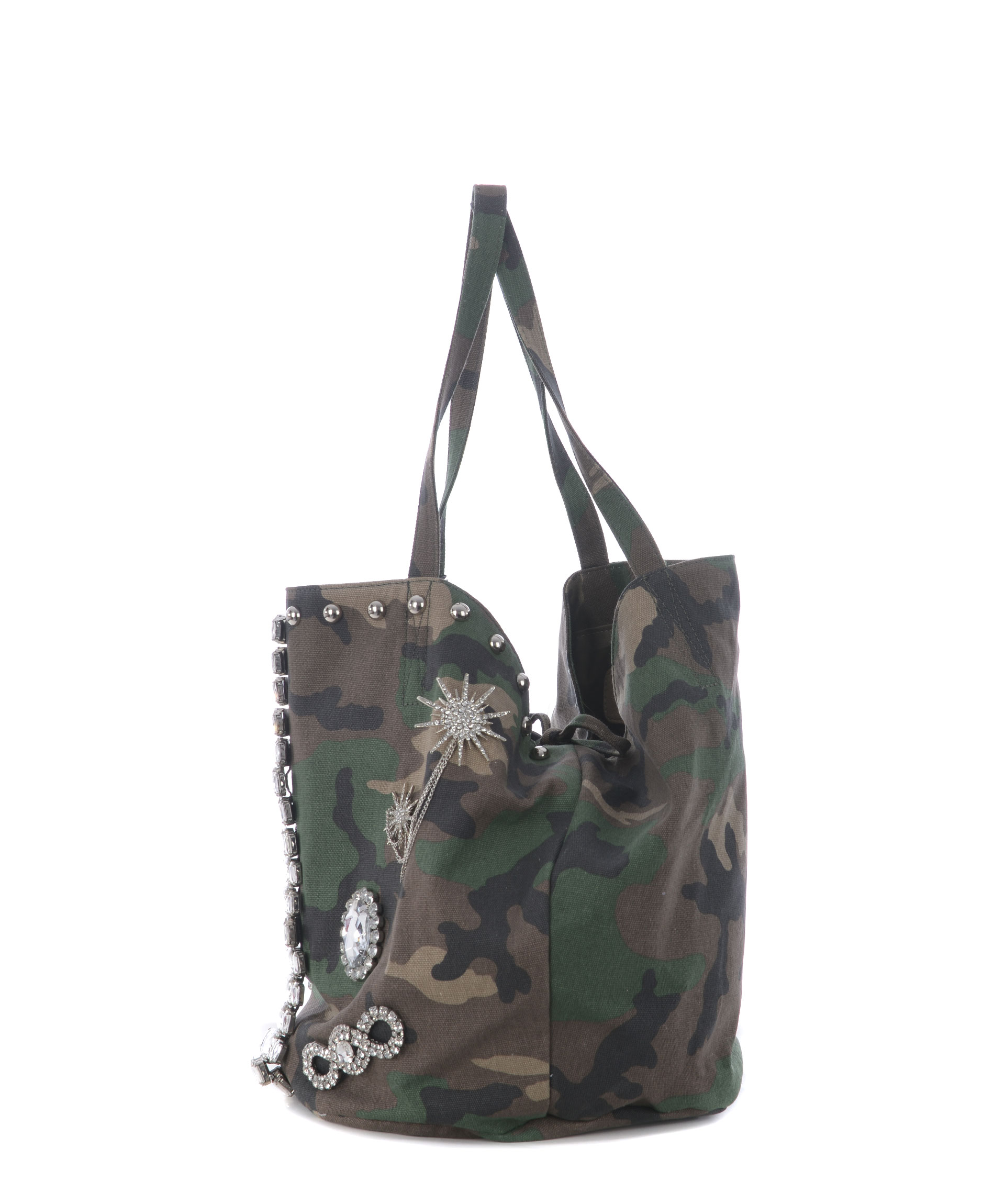 Sacca Mia Bag in canvas Camouflage. Decorazione frontale con strass e castoni. Due manici in canvas. Tracolla in suede beige non removibile. Chiusura con bottone a calamita. All'interno tasca con zip e tasche applicate. Foderata. Decostruita.