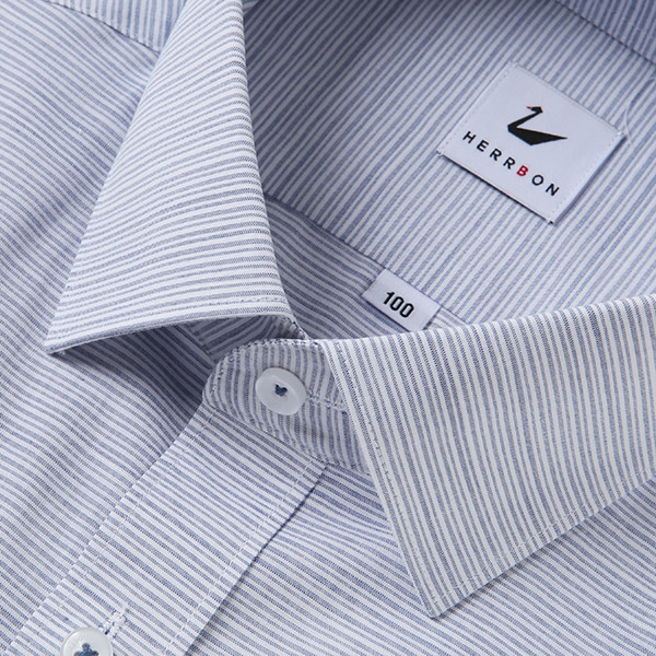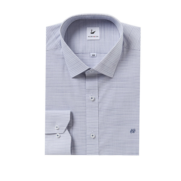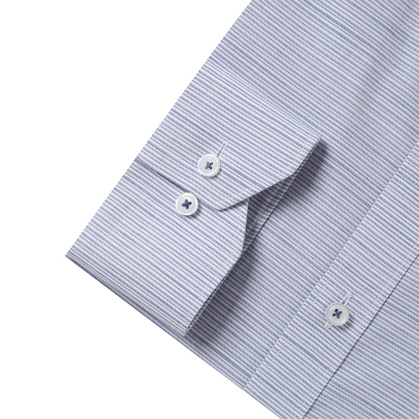 주머니가 없는 슬림형 스타일로 슬럽사가 가미된 캐주얼한 무드의 면혼방 호리존탈 패턴 셔츠