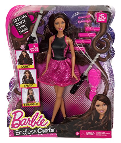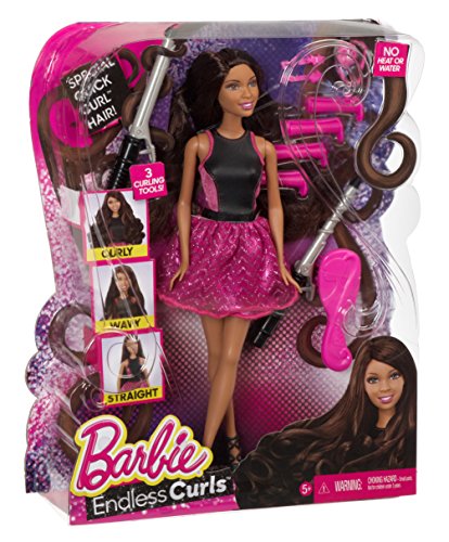 -. Binding : Toy -. Brand : Barbie -. EAN : 0899978194398 -. Feature : Let the possibilities go to your head with this Barbie doll! / Her luxe, long hair is designed to be curled, straightened and curled again for endless styling possibilities / Two no-heat curling tools and four no-heat curlers allow girls to curl Barbie doll's entire head of hair - for the first time ever! / Additional styling accessories include a brush, two barrettes and label-art rubber bands / Barbie doll wears an on-trend pink and black party dress with glittering detail and amazing black cutout shoes -. IsAdultProduct : 0 -. Label : Mattel -. Manufacturer : Mattel -. Model : BMC02 -. MPN : BMC02 -. PackageQuantity : 1 -. PartNumber : BMC02 -. ProductGroup : Toy -. ProductTypeName : TOYS_AND_GAMES -. Publisher : Mattel -. Studio : Mattel -. Title : Barbie Endless Curls African-American Doll -. UPC : 659213144010 -. Warranty : No Warranty