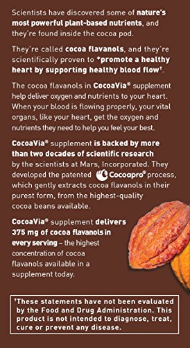 ReleaseDate : 2013-07-15 Studio : CocoaVia Publisher : CocoaVia Binding : Health and Beauty Product Description The cocoa bean packs some of nature's most powerful phytonutrients called cocoa flavanols to help our body stay in tune. Numerous scientific studies have demonstrated that these cocoa flavanols promote healthy blood flow from head to toe†. Our heart, brain and muscles depend on a healthy circulatory system. It helps us feel our best and perform at our highest. And supporting healthy blood flow is essential to helping you maintain who you are for years to come. The concentrated cocoa extract in CocoaVia® daily supplement is made using our patented Cocoapro® process. CocoaVia® dietary supplement is intended for personal individual use. 0