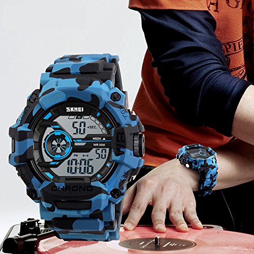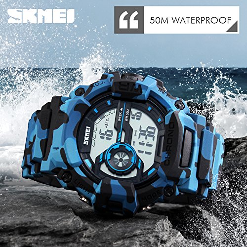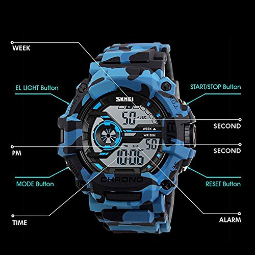 -. Feature : Light, StopWatch, Waterproof, Shockproof, Calendar, EL Backlight, Alarm Clock, this sport watch is perfect fit with all kinds of sports and it's really an everyday watch / Fashionable, very charming for all occasions. Amazing looking watch, a great gift for family and friends / Fashionable sporty dial design, military style outlook. Large Dial and numbers with light, show time clear in the dark / 164 Ft / 50 M water resist, Support to swim and bathe in cold water. Please DONOT press any buttons underwater, and in case of damaging waterproof ring,please keep it away from steam and hot water / Any question about the product, please feel free to contact us by Email, we will offer you 100% satisfaction