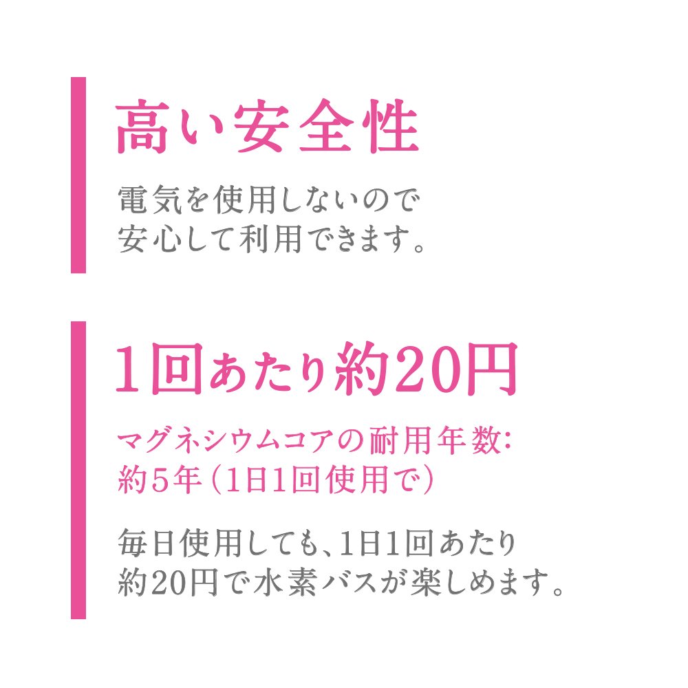 ■ About 20 yen per time Even if you use it every day, you can enjoy a hydrogen bath at about 20 yen per once a day.