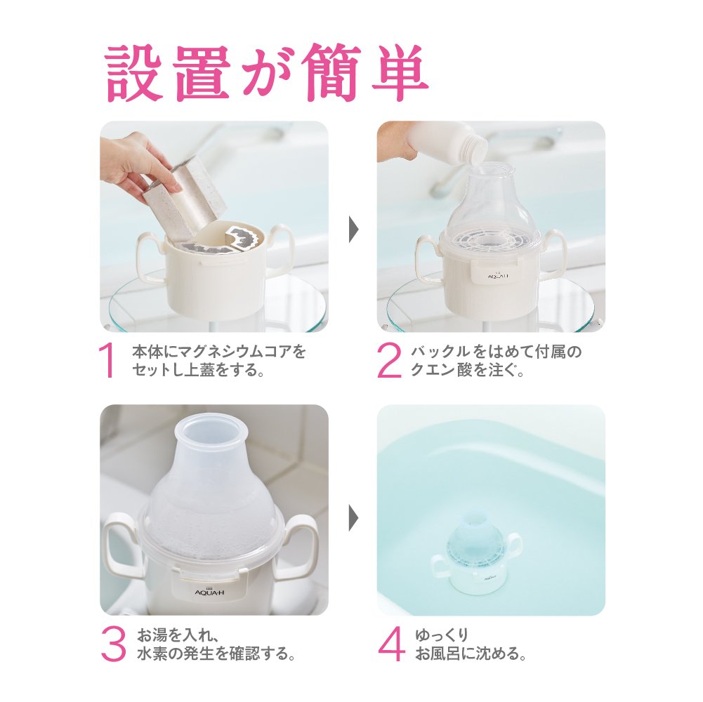 ■ Easy installation Hydrogen is generated simply by setting citric acid and submerging it in a bath.