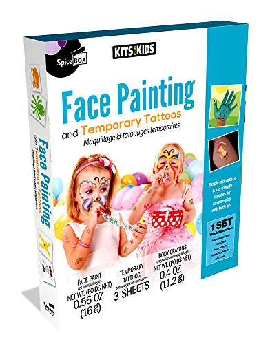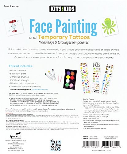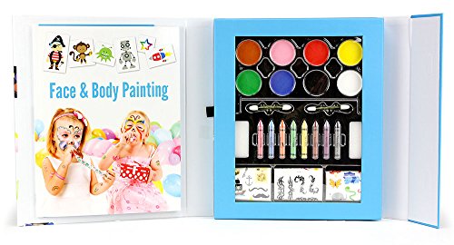 Studio : Distribution Solutions LLC Publisher : Distribution Solutions LLC Binding : Toy Product Description Face and Body Painting Has Never Been This Fun ! Create your own magical world of fairies, animals, or fish with these fabulous face-painting designs! This kit features water-based paints that are easy to apply and wash off, and are safe for children's skin! In addition, the guidebook features step-by-step instructions to help you create 12 fantastic looks that are easy and imaginative. Or just stick on the ready-made tattoos for a fun way to decorate yourself and your friends! This Face Painting Kit Includes: - 1 Instruction Book - 8 Cakes of Paint - 2 Makeup brushes - 2 Makeup Sponges - 8 Face and Body Crayons - 3 Sheets of temporary tattoos. 0