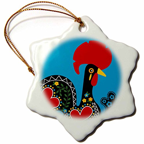3dRose orn_160660_1 The Black Portuguese Rooster on a Blue Background with a Heart Snowflake Ornament, Porcelain, 3-Inch