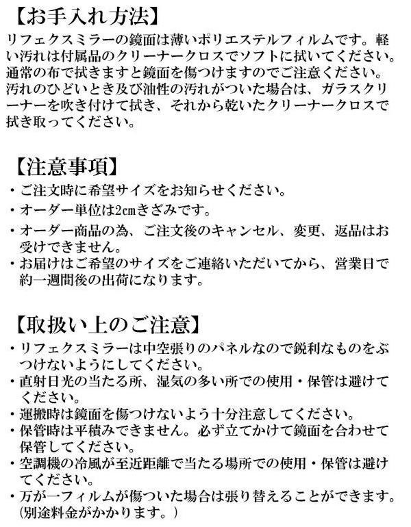 | リフェクスミラーは舞台やコンサート、ジム等さまざまな業界で長年使用されているプロ仕様のフィルムミラーです。落ちたり倒したりしてもガラス鏡のように割れて飛散することがなく、軽量なので女性でも楽に持ち運べ、壁に掛けることもできます。鏡面の極薄フィルムが高い反射率を実現。従来の鏡よりもくっきりと鮮明に、自然な色に映ります。サイズオーダーですので、あなたにピッタリのサイズが作れます。 |