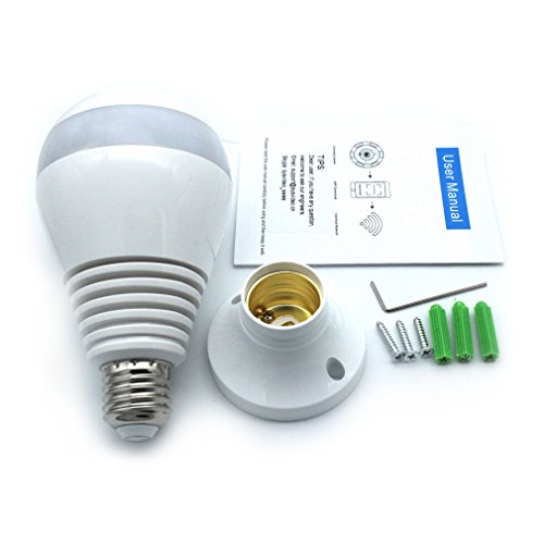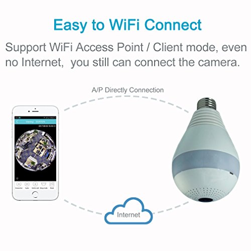 -. Feature : COVERT LENS: the camera appearance is a light bulb, the lens is small and at the bulb bottom, it is not easy to find this is a camera. / 360 DEGREE PANORAMIC & ePTZ: the wide angle fisheye lens with 1080P high resolution, one camera can cover whole room, save the camera quantity and cost. It support 5 different view correction modes and ePTZ (electronic Pan/Tilt/Zoom) to control the vision. / TWO WAY AUDIO SPEAKING: Communicate with your families, friends and your pets freely by cellphone and camera with clear audio. / SD CARD RECORDING: Support up to 64G Micro SD card (TF memory ) video recording. / APP REMOTE MONITORING: Supporting iPhone/Andorid phone, iPad APP remote internet or local WiFi online watch your nanny, baby or pets.