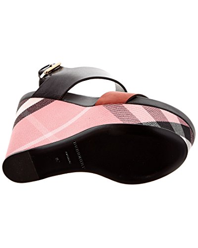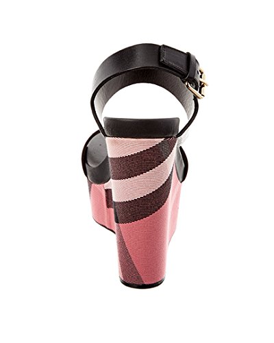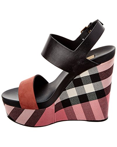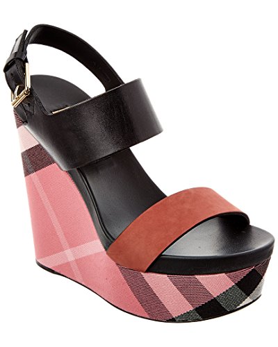 Studio : Burberry Publisher : Burberry Binding : Apparel Product Description Please note: Size selections are European. For US conversions, please reference size chart.. Made in Italy. Color/material: black leather, rose pink nubuck leather, pink house check canvas. Design details: gold-tone hardware. Adjustable ankle strap with buckle closure. Lightly padded leather insole. Smooth leather sole. 5.5in heel. 2in platform. Please note: All measurements are approximate and were taken from a size 37; slight variations may occur. 0