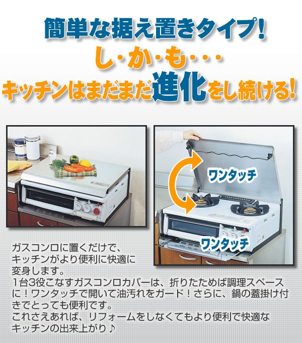 | 1台3役こなすガスコンロカバーは、折りたためば調理スペースに!ワンタッチで開いて油汚れをガード!さらに、鍋の蓋掛け付きでとっても便利です。これさえあれば、あなたのキッチンはまだまだ進化します!※ガスコンロカバーのみのお届けとなっております。 |