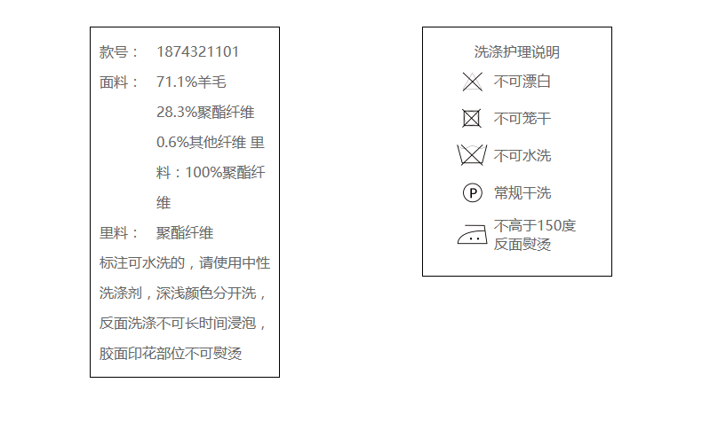 71.1%羊毛 28.3%聚酯纤维 0.6%其他纤维 里料:100%聚酯纤维
