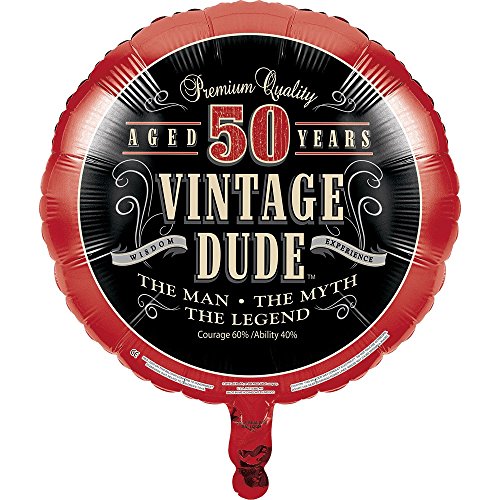 -. Feature : Coordinating Vintage Dude 50th Birthday Party Decoration Bundle Includes - / (1) Jointed Banner measuring 7"x 5.5' featuring Red/Black "Aged 50 Years Vintage Dude" Design / (1) Honeycomb Centerpiece measuring 12"x 12" featuring Red/Black "Aged 50 Years Vintage Dude" Design / (1) 18" Metallic Balloon featuring Red/Black "Aged 50 Years Vintage Dude" Design / (1) Package of 15 Classic Red 12" Latex Balloons, (1) Package of 15 Velvet Black 12" Balloons and 500 yds of Black Curling Ribbon