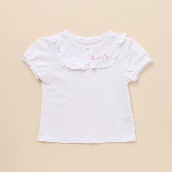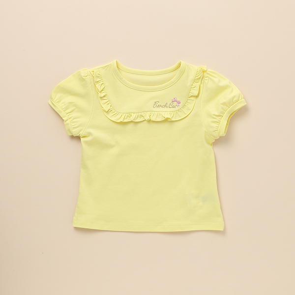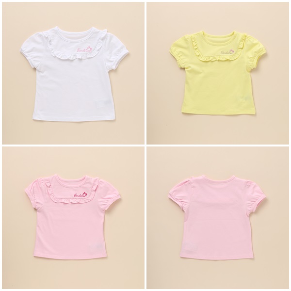 상품설명 깔끔한 화이트,핑크,옐로우 컬러의 귀여운 프릴 반팔 퍼프소매 TS입니다. 톈션좋은 원단을 활용해 편안하게 입을수 있는 아이템이며, 넥에 프릴 장식과 귀여운 로고 리본 자수로 더욱 귀여운 느낌을 더해주었습니다. 심플하고 귀여운 라인의 기본 TS로 데일리 아이템으로 어느 착장에나 활용하기 용이합니다.