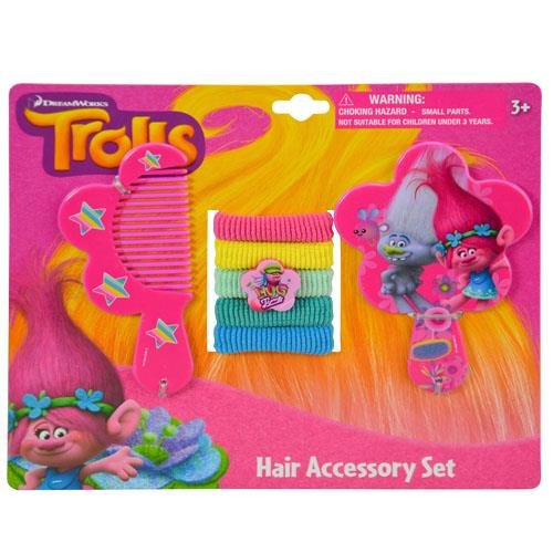 Studio : Dreamworks Trolls Publisher : Dreamworks Trolls Binding : Toy Product Description Now your little one can style their hair with the optimistic Princess Poppy and her Snack Pack pals. In the Dreamworks Officially Licensed Trolls Hair Accessory Set your little girl will have 5 colorful hair ties to choose from, a pink comb to brush her hair with, and a hand mirror to check out her hair-do! This darling Trolls hair accessory set will keep your child's hair under control! Whether your girl prefers pony tails, pig tails, or braids the 5 bright hair ties will be sure to keep them in place all day. The size of the brush and the comb are 4" x 3" which makes it easy to stash in a backpack or purse so your little one can use these on the go. This hair accessory set is sure to make your little one feel confident and stylish with the helpful boost from the positive Princess Poppy! The Dreamworks Trolls Princess Poppy Hair Accessory Set is a great stocking stuffer or gift for the little girl who loves dress up! 0