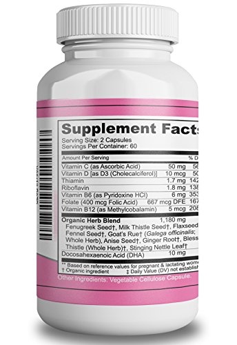 -. Feature : Natural Lactation support using Organic Herbs. A safe and most of all effective way to aid in increased Breastmilk production. / Proven Herbs that have been used for centuries in different cultures - Fenugreek, Milk Thistle, Flaxseed, Fennel Seed, Goat's Rue, Anise Seed, Ginger Root, Blessed Thistle and Stinging Nettle / Premium Vitamins for better absorbtion! DHA added to support healthy infant development / Effective Formulation using the finest ingredients right here in the USA in a FDA registered Food Grade Facility to GMP standards / We stand by our products and offer a 100% money back Guarantee!!!
