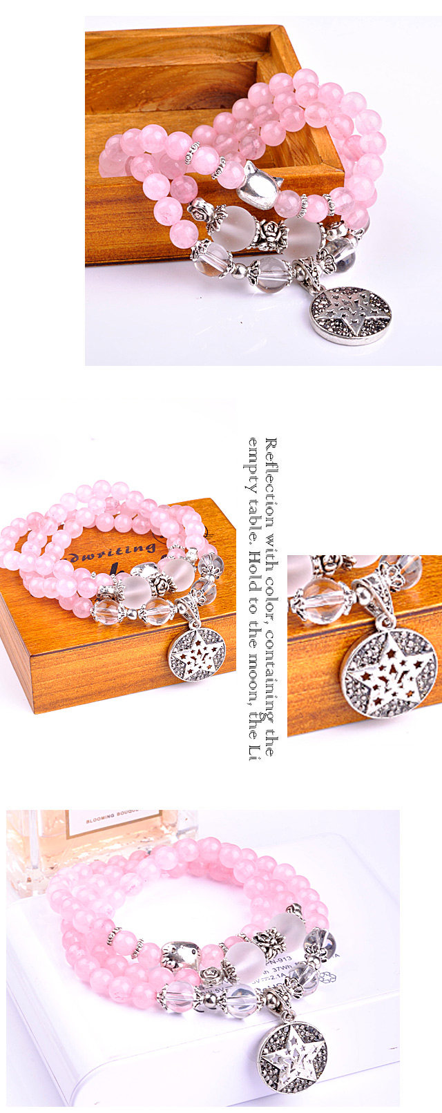 韩版时尚粉色天然石水晶手链 五角星吊坠手串 招桃花好运首饰