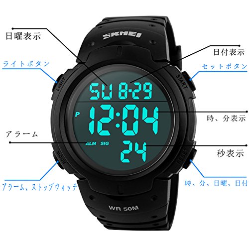 -. Feature : デジタル時計:ファッショナブルなスポーティーなダイヤルデザイン、軍事的な見通し。 大きなダイヤルと暗い数字で暗闇の中で明かりを見せます。輸入ELランプを使用して、 "LIGHT"ボタンを押すと、明かりのある時間を明確に見られます / メンズウォッチ:メンズ、特にスポーツ、耐衝撃、ストップウォッチ、ミリタリー24時間モード、LEDバックライト機能を好む人にアピールすることで、あらゆるスポーツや日常使用に最適です / 耐衝撃性、ランニング、登山、釣り、ectなどのアウトドアスポーツとアウトドアスポーツに最適 / 多機能時計:自動日付、アラーム、防水、LEDディスプレイ、耐衝撃性、ストップウォッチ、バックライト / 防水:164 Ft / 50 M防水、冷水での水泳と入浴をサポートします。 水中でボタンを押したり、防水リングを破損した場合は水蒸気や湯から離してください。