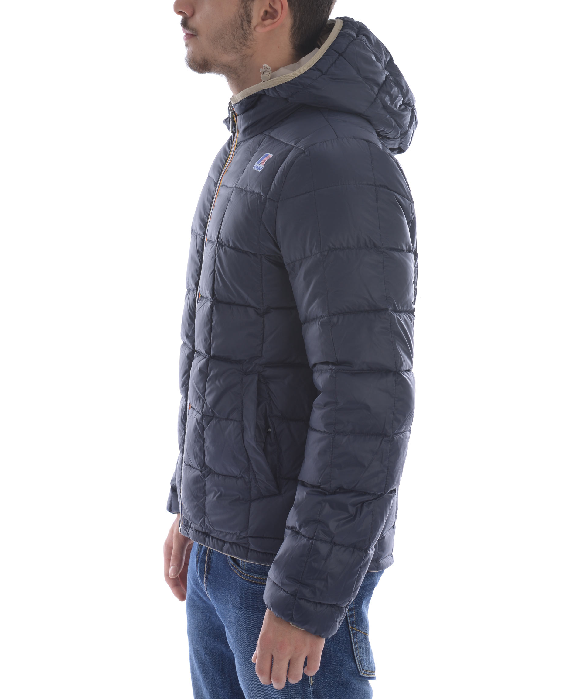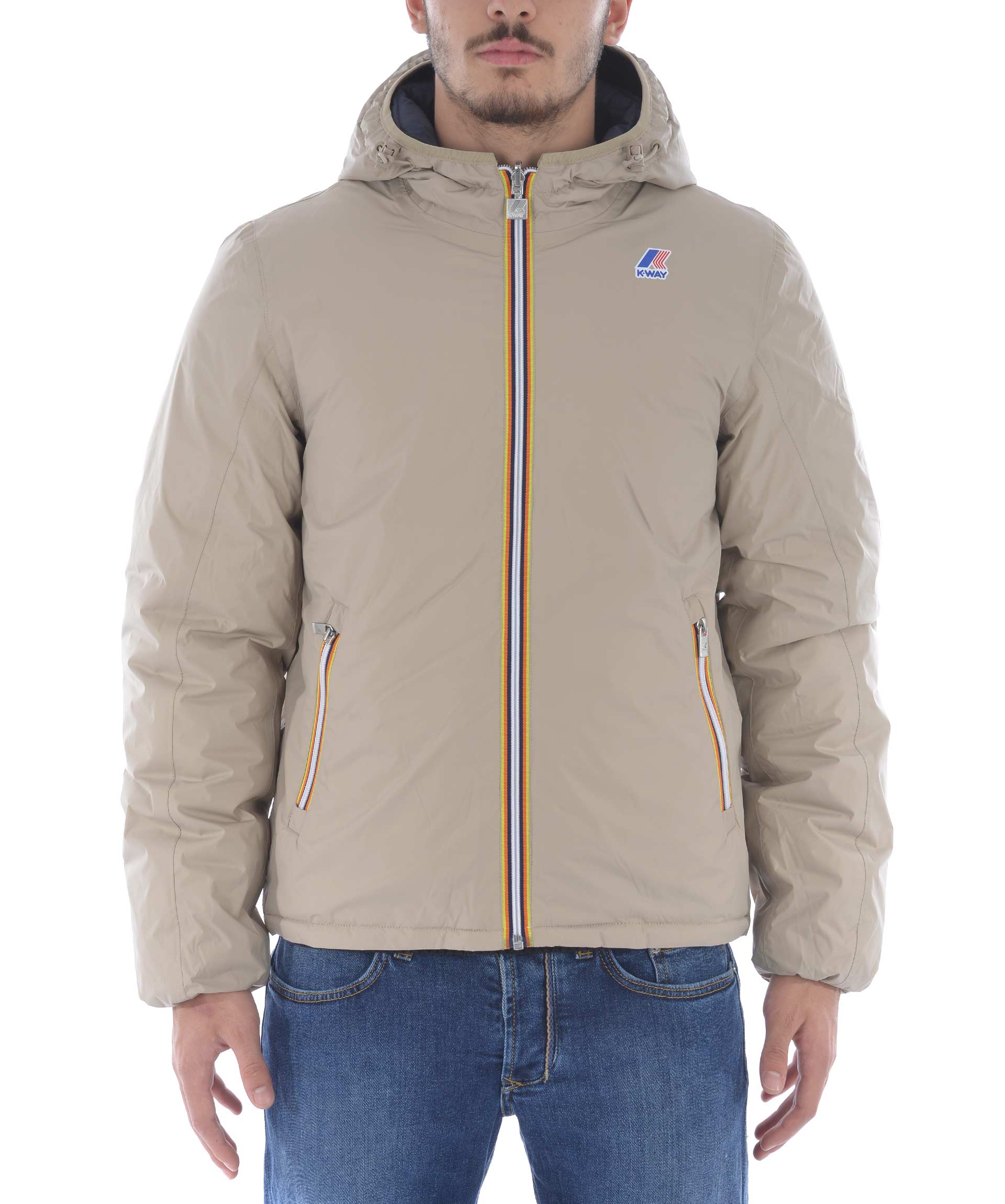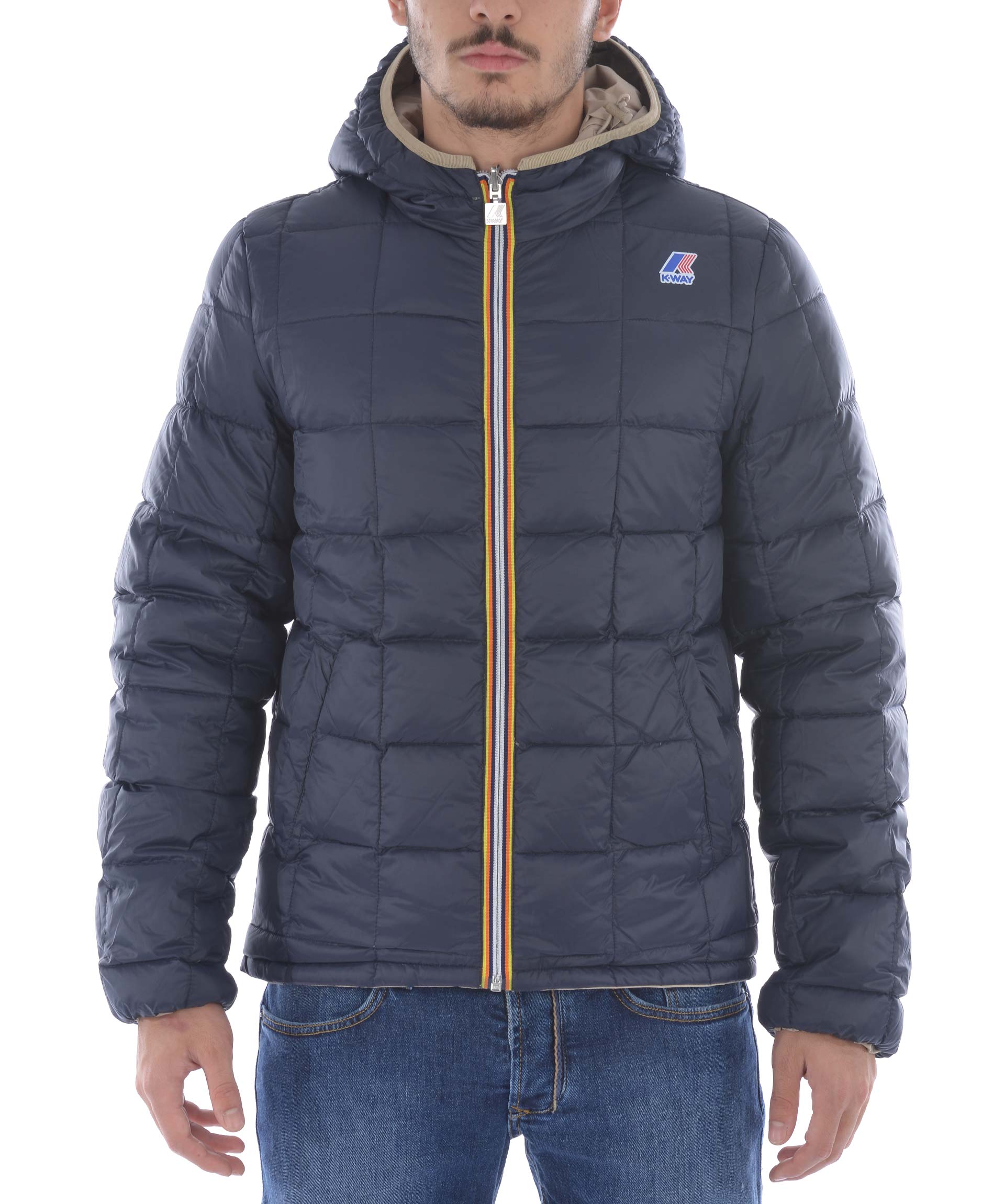 Piumino K-Way in nylon double face. Un lato Blu scuro trapuntato, lato opposto Beige non trapuntato. Imbottito con piume d'oca. Cappuccio fisso con coulisse. Chiusura frontale con zip. Tasche frontali con bottone a pressione sul lato blu, e con zip sul lato beige. Polsini elasticizzati. Logo stampato sul petto.