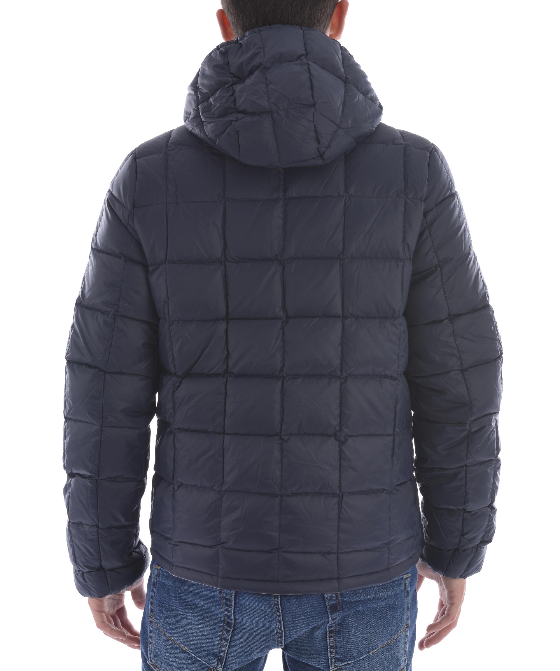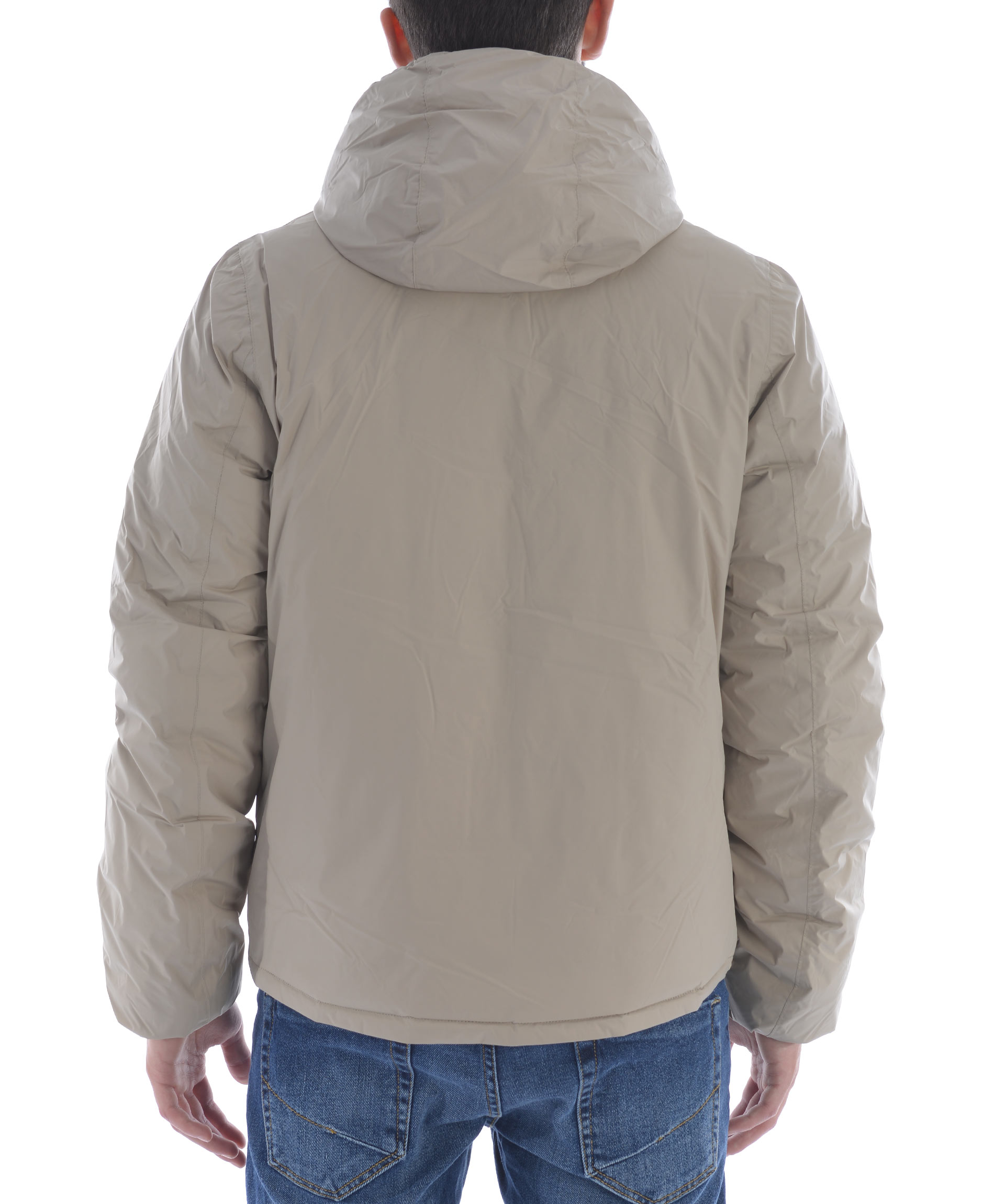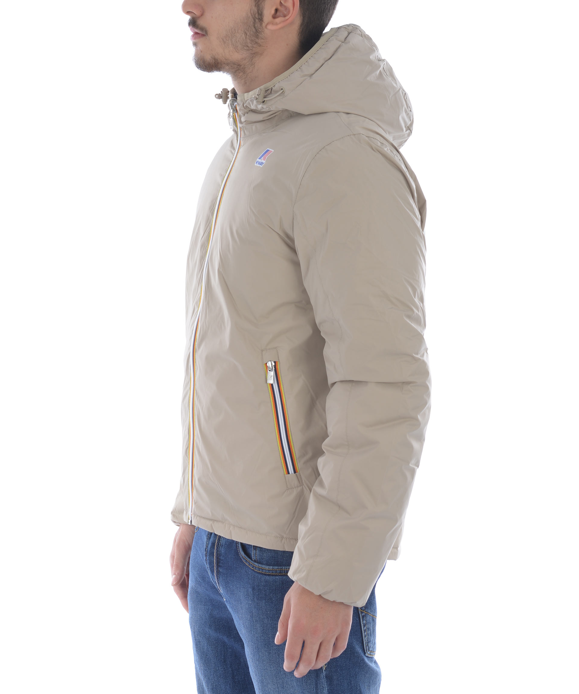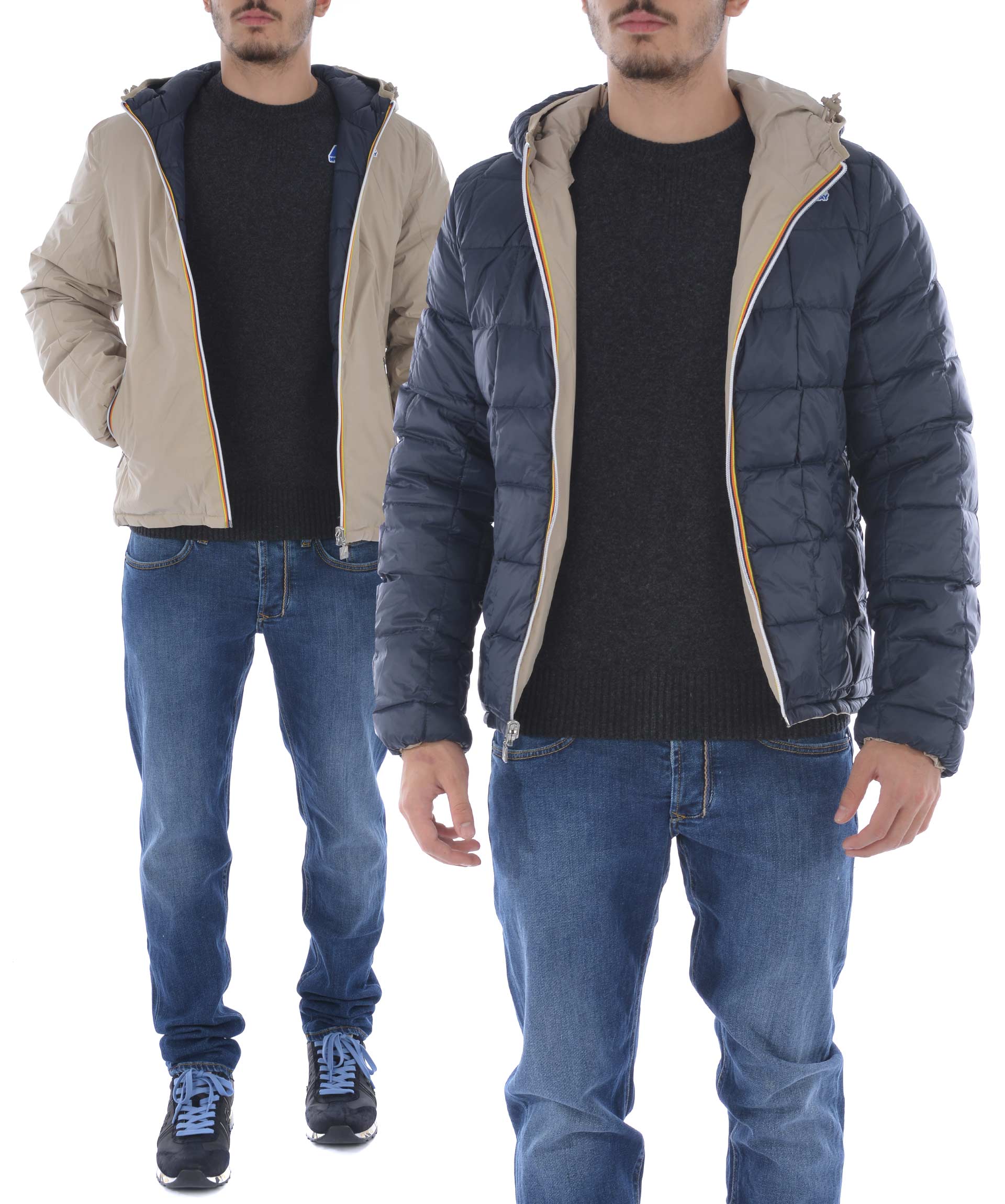Piumino K-Way in nylon double face. Un lato Blu scuro trapuntato, lato opposto Beige non trapuntato. Imbottito con piume d'oca. Cappuccio fisso con coulisse. Chiusura frontale con zip. Tasche frontali con bottone a pressione sul lato blu, e con zip sul lato beige. Polsini elasticizzati. Logo stampato sul petto.