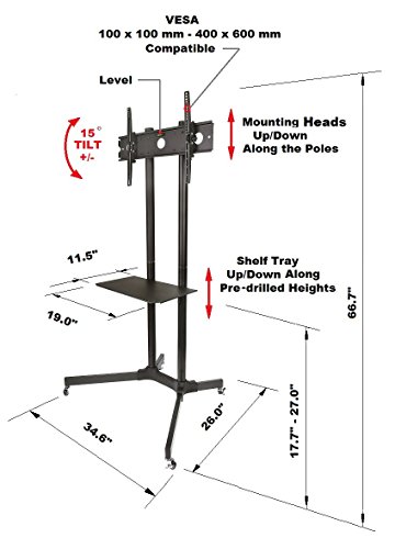 Fits most LCD/LED Plasma Flat Panel TV screens between 30”-65”, Up to 132 lbs (60 kgs) Compatible with VESA 100 x 100 mm through 400 × 600 mm, W x L x H = 26.0" x 34.6" x 66.7"