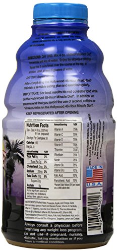 -. Binding : Health and Beauty -. Brand : Hollywood Miracle Diet -. EAN : 0799472711117 -. Feature : Case of two 32-ounce bottles of weight-loss liquid supplement (total of 64 ounces) / Made with vitamins, minerals, and antioxidants to detoxify and rejuvenate your body / Can help you lose up to 10 pounds in 48 hours / An ideal jump start to any diet / Pasteurized -. Label : Hollywood Miracle Diet -. LegalDisclaimer : This price is for two 32oz bottles -. Manufacturer : Hollywood Miracle Diet -. MPN : 690615480016 -. NumberOfItems : 2 -. PackageQuantity : 2 -. PartNumber : 690615480016 -. ProductGroup : Health and Beauty -. ProductTypeName : HEALTH_PERSONAL_CARE -. Publisher : Hollywood Miracle Diet -. ReleaseDate : 2015-06-22 -. Size : 32oz -. Studio : Hollywood Miracle Diet -. Title : Hollywood 48-Hour Miracle Diet, 32-Ounce Bottles (Pack of 2) -. UPC : 799472711117