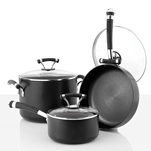 Professional heavy guage hard anodized construction provides fast, even heating and exceptional durability. TOTAL NONSTICK system features High-Low wave technology coupled with the most advanced nonstick surface to offer extraordinary food relase and lifelong durability. Advanced nonstick inside and out ensures clean-up is quick and easy. Contemporary, stylish double riveted stainless steel with silicone handles for a secure, slip-free grasp. Oven safe to 400-degrees F. Domed, tempered glass lids with stainless steel rims allow you to watch foods cook without losing heat, flavors or nutrients.Feature