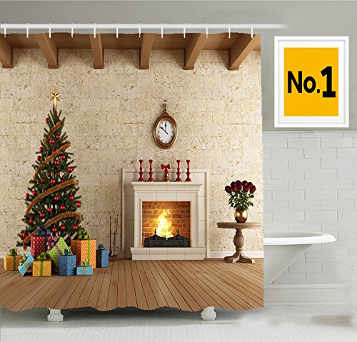 -. Title : Shower Curtains Christmas Interior Clock Wood planks Fireplace Christmas tree Gifts 3D Graphics Polyester Fabric Bathroom Set