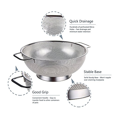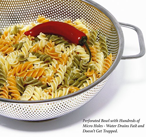 Colander - Stainless Steel with Handles - Micro Perforated Fine Mesh Strainer with Solid, Large Stable Base - Deep Bowl - Perfect for Washing, Rinsing, Draining Pasta, Vegetables & Fruit