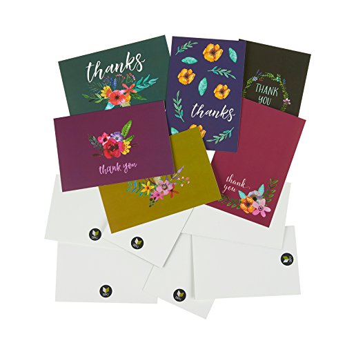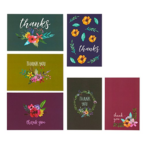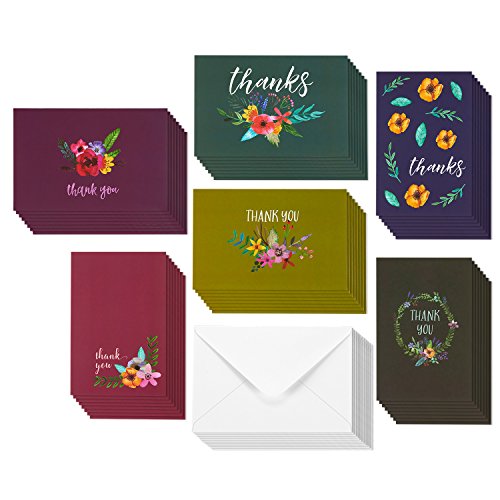 48 Thank You Greeting Cards - Jewel Toned Watercolor Flower Floral Thank You Designs, Envelopes Included - 4 x 6 Inches