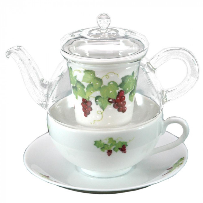 1人用ティーポットとティーカップがセットで、カップとポットが重なる形状が特徴の「ティーフォーワン」。ガラスのティーポットには陶磁器の茶こしをセットしました。ガラスの透明性と陶磁器のあざやかな絵柄が、上品でおだやかな時間を演出します。おもてなしやギフトにも最適☆ 製造国:茶こし・カップ・ソーサー:日本、ポット:中国 素材・材質:ポット:耐熱ガラス茶こし・カップ・ソーサー:磁器(有田焼) 仕様:容量:ポット/300cc、カップ/220cc耐熱温度差:120度電子レンジ使用可食洗機使用可 セット内容:●ポット:約9.5×15×H10.5cm(フタ含む)●茶こし:約径7×H6.5cm●カップ:約9.5×11.5×H5cm●ソーサー:約径13.8cm ※サプライヤー直送品 ご注文後3~4営業日後の出荷となります【商品名】有田焼 セランドグラス ティーフォーワン ぶどう TFO-003