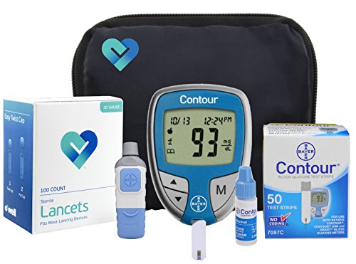-. Title : Bayer Contour Complete Diabetic Blood Glucose Testing Kit, Meter, Test Strips, Lancets, Adjustable Lancing Device, Control Solution, Owners Log Book & Manual